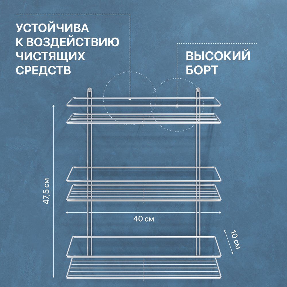 Габариты полки составляют 40 см в ширину, 10 см в глубину и 47.5 см в высоту, что позволяет ей вместить достаточно предметов, оставаясь компактной. Глянцевое покрытие добавляет визуального блеска и защищает от коррозии. Полка произведена в России, что гарантирует высокое качество изготовления и соответствует всем стандартам.