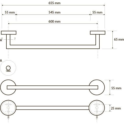 Полотенцедержатель имеет размеры 65,5x5,5 см, что делает его подходящим для любых ванных комнат. Благодаря использованию матовой нержавеющей стали, изделие не только отлично выглядит, но и обладает высокой устойчивостью к влажной среде.