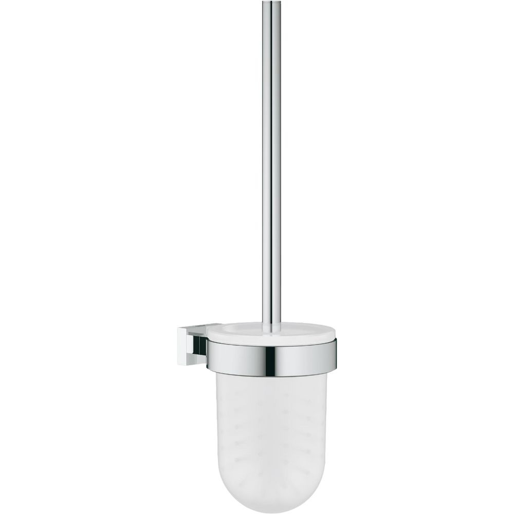 Ершик Grohe Essentials Cube имеет габариты 9.6x12.5x37.5 см, что позволяет его удобно разместить в ванной комнате. Его подвесная конструкция экономит пространство и обеспечивает легкий доступ. Изготовленный из латуни и стекла, он привносит в интерьер элегантность, а глянцевая отделка сочетается с матовой колбой, придавая акцент стилю. Открытая конструкция без крышки придаёт современный вид и упрощает обслуживание. Гарантия на изделие составляет 1 год, что подкрепляется надёжностью немецкого производства.