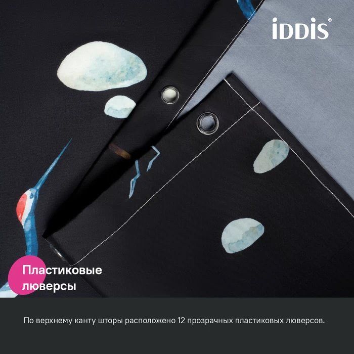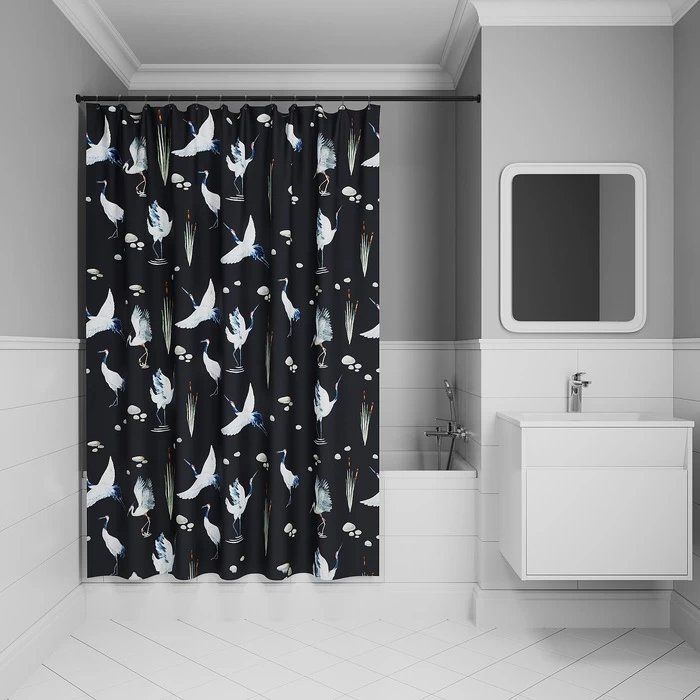Размеры шторы составляют 180x200 см, что подходит для большинства ванных комнат. Изготовлена из полиэстера плотностью 90 г/кв.м, штора имеет люверсы и готовые отверстия для 12 крючков или колец, которые уже входят в комплект. Специальное покрытие предотвращает образование следов после высыхания капель воды. Продукция прошла проверку качества в Китае и России и сопровождается годовой гарантией.