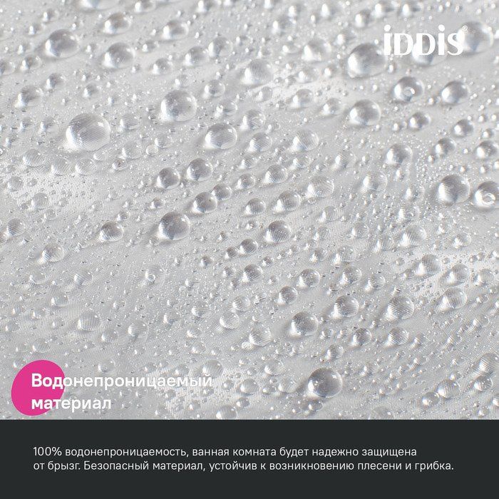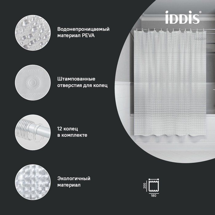 Штора IDDIS Promo имеет размеры 180x200 см, что идеально подходит для стандартных ванных комнат. Изготовлена из PEVA — экологичного и безопасного материала, она укомплектована 12 люверсами и крючками для легкой установки. Специальное водоотталкивающее и антибактериальное покрытие сохраняет вашу ванную свежей и чистой. Утяжелительный шнур помогает шторам оставаться неподвижными. Для ухода достаточно мягкой влажной ткани.