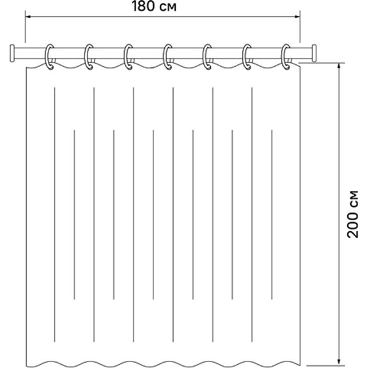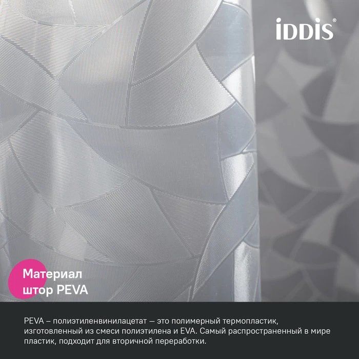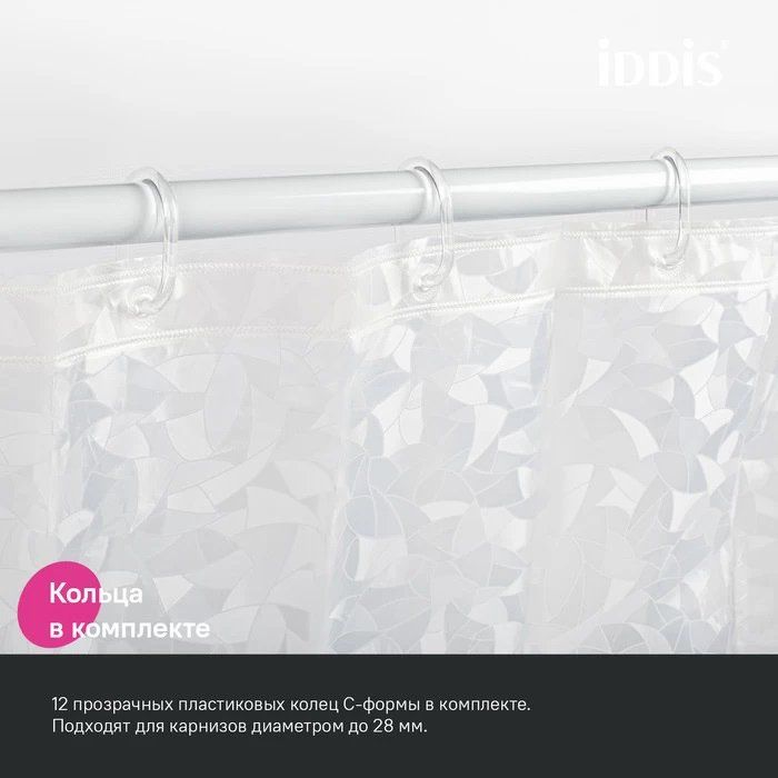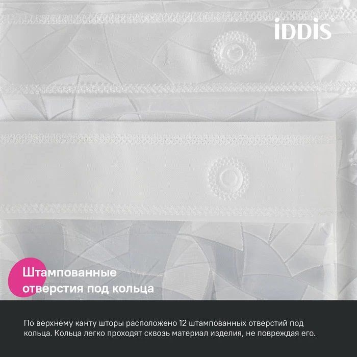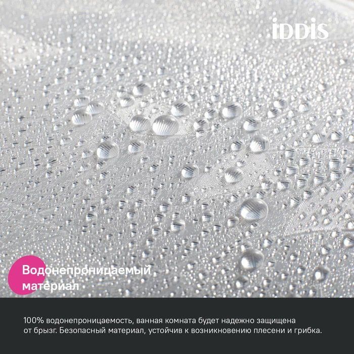 IDDIS Promo P02PV18i11 имеет стандартные габариты 180х200 см, что подходит для большинства ванных. В комплекте предусмотрено 12 готовых отверстий, начиная с люверсов, и прилагаются крючки/кольца для легкой установки. Штора оснащена утяжелительным шнуром, обеспечивающим ровное, без складок висение.