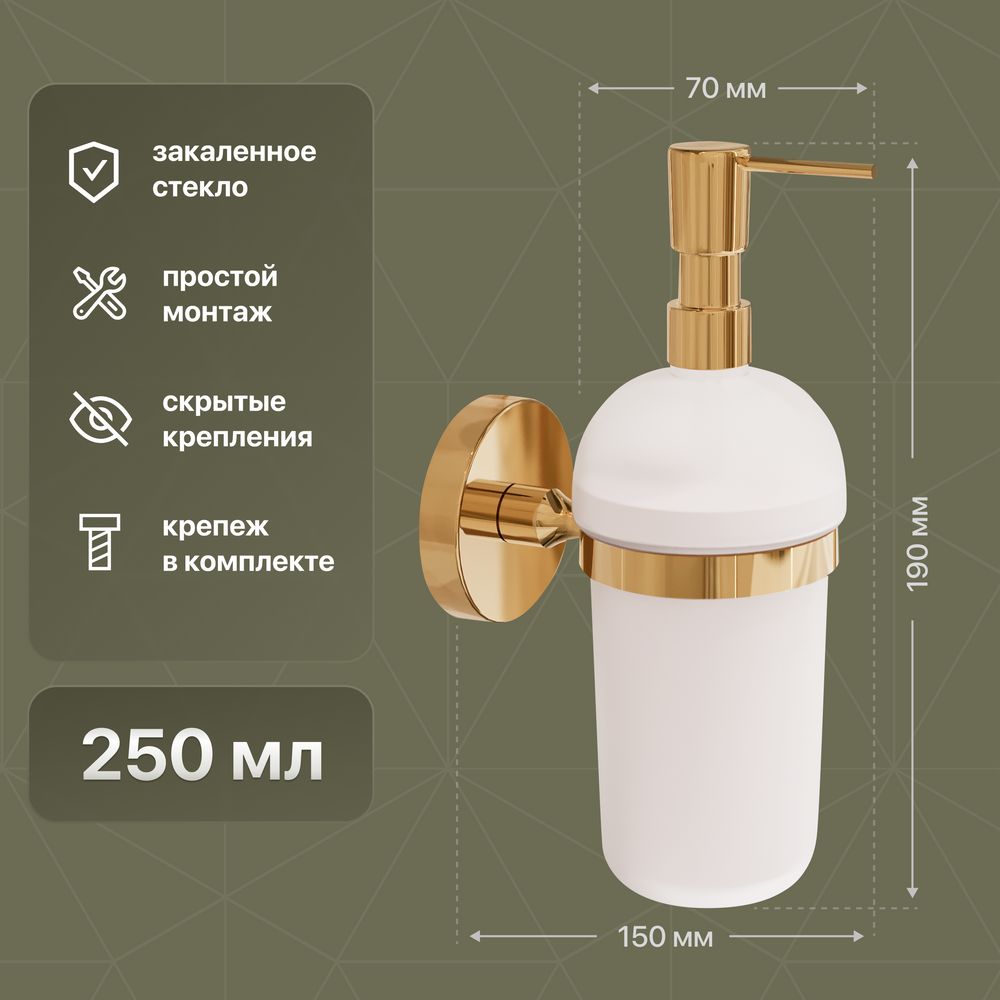 Дозатор DEKOR BANYO Alina Gold выполнен из качественной латунной, стеклянной и алюминиевой комбинации. Размеры изделия составляют 7x15x19 см, а объем — 0.25 л, что делает его практичным для использования у раковины. Универсальный подвесной крепеж позволяет разместить дозатор в удобном для вас месте.