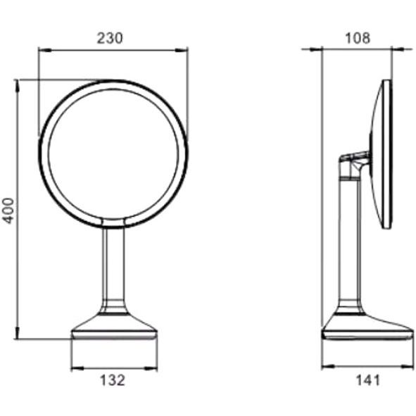 Зеркало имеет размеры 23x40x14.1 см, выполнено из прочной латуни, обеспечивающей долговечность. Сенсорное управление предусмотрено для комфортного использования — включается легким касанием сенсорной кнопки. Зеркало питается от сменных батарей, что позволяет избежать лишних проводов на столе.