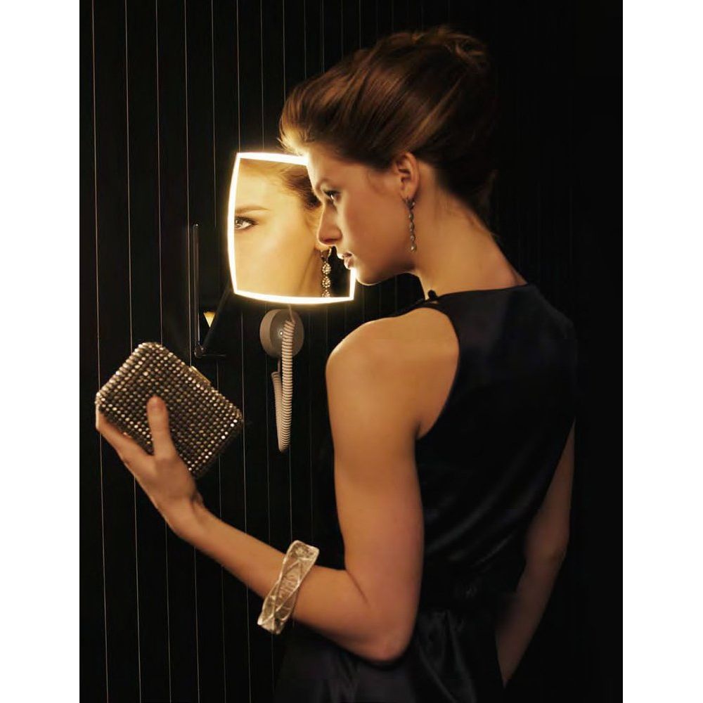 Зеркало имеет размеры 20x30.6x11.1 см и выполнено в подвесном варианте. Материал — латунь с глянцевым покрытием, обеспечивающим дополнительный блеск. Оснащено сенсорным выключателем, позволяющим менять оттенок света лёгким касанием. Поворотные элементы конструкции гарантируют удобную настройку положения, а телескопический кронштейн добавляет универсальности в использовании. Подсветка реализована на основе светодиодов мощностью 4,5 Вт. Подключение осуществляется при помощи встроенного в стену кабеля, который не препятствует декоративной отделке.