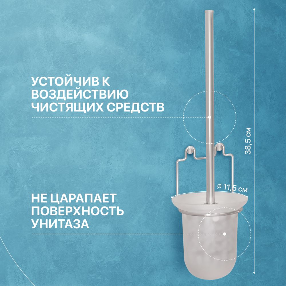 Ершик DIWO Смоленск (артикул ПК14801), подвесной, из нержавеющей стали и стекла, с размерами 11.5x13.5x38.5 см, отличается открытой конструкцией и мягкой щетиной, которая бережно чистит поверхность.