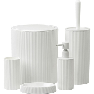 - Полный комплект — в набор входят ершик, стакан, дозатор, мыльница и мусорное ведро, что обеспечивает комплексный подход к организации ванной комнаты.