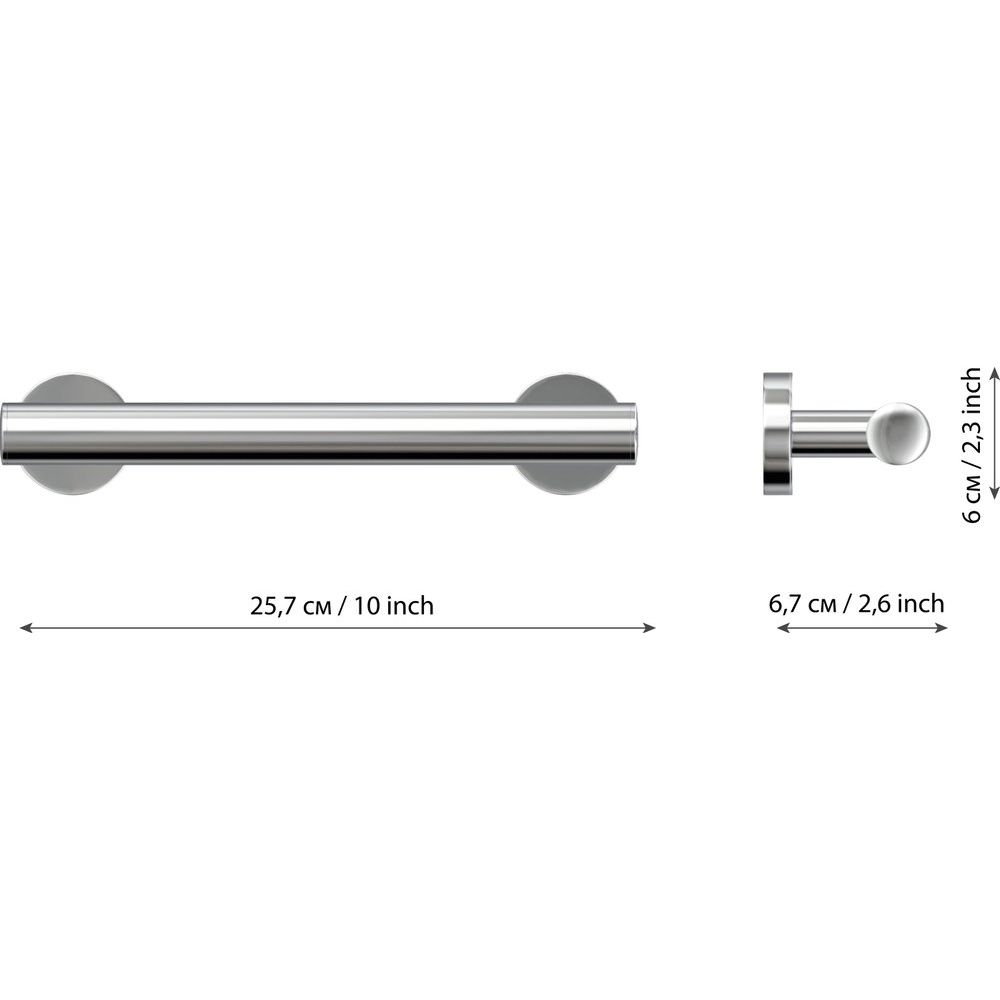 Габариты поручня составляют 25.7x6.7x6 см, что делает его компактным и универсальным для любой планировки ванной комнаты. Подвесной монтаж упрощает установку, а прочный сплав металлов гарантирует долговечность использования. Благодаря глянцевому покрытию, поручень легко очищается, сохраняя безупречный внешний вид.