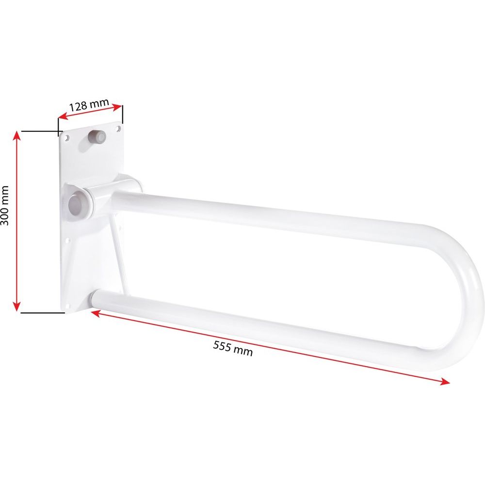 Поручень имеет габариты 12.8x55.5x30 см, что делает его компактным, но функциональным. Изделие выполнено из нержавеющей стали, устойчивой к воздействию влаги, обеспечивая долговечность использования. Подвесной механизм позволяет удобно складывать поручень после использования, что особенно актуально для небольших помещений.