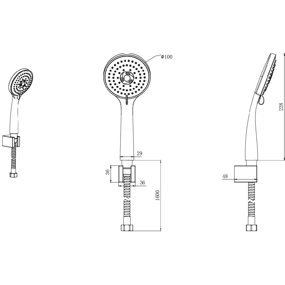 - В комплекте: держатель душевой лейки; душевая лейка; душевой шланг из нерж. стали 160 см