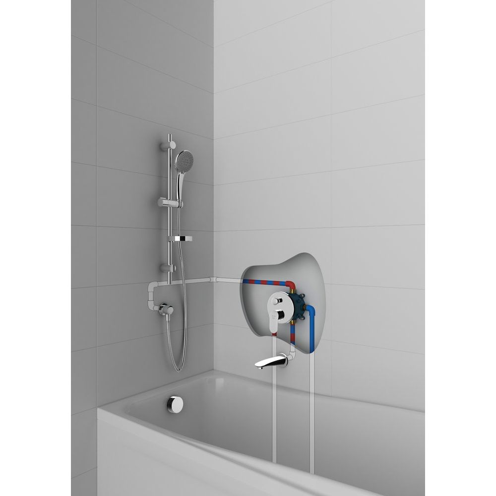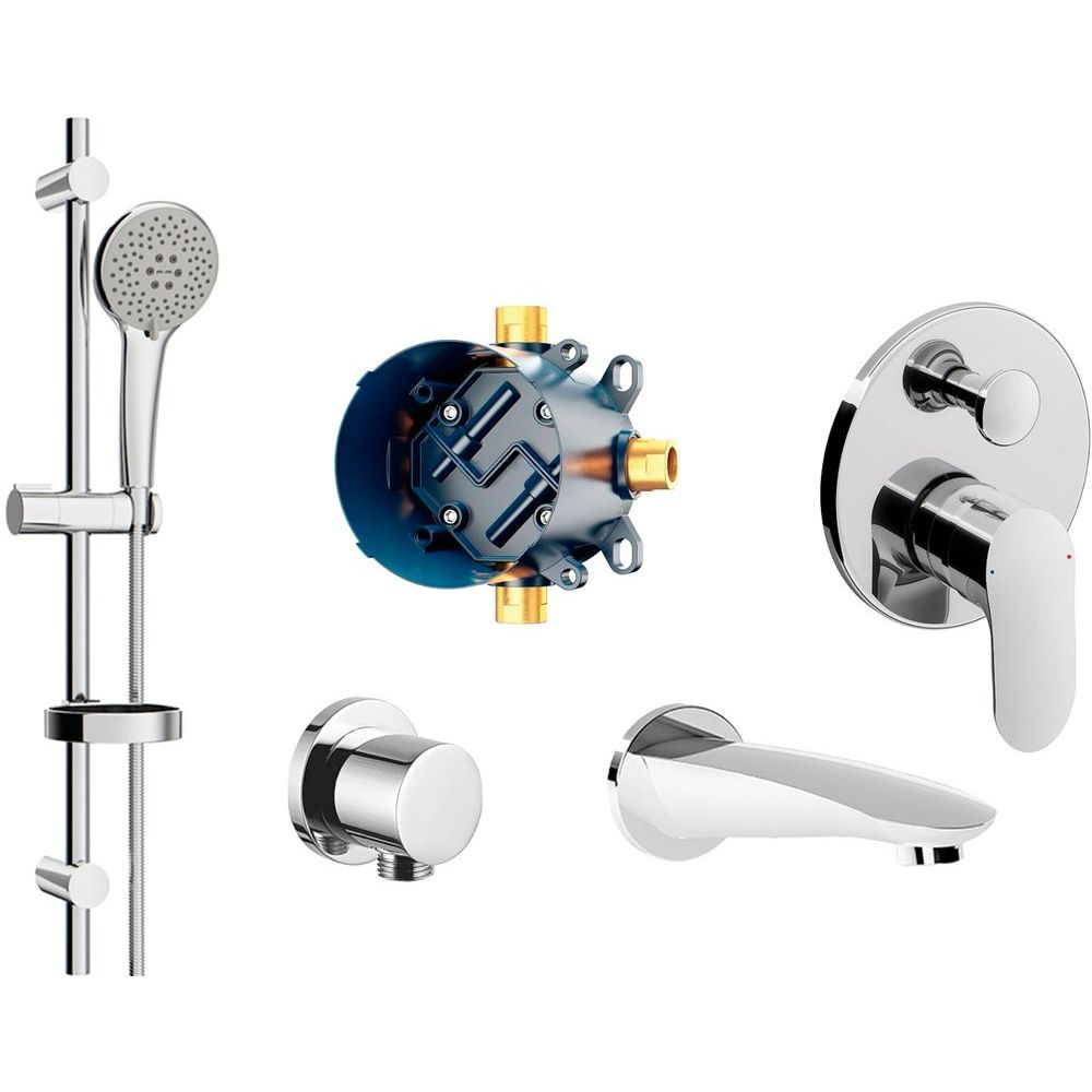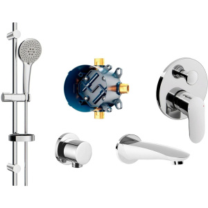Душевой комплект включает множество компонентов, каждый из которых создан с акцентом на функциональность и долговечность. Основой комплекса является монтажная коробка AM.PM MultiDock, шириной 17 см, изготовленная из металла и пластика, которая служит базой для смесителей или термостатов. Смеситель для ванны с душем AM.PM Like имеет встроенный девиатор и керамический картридж, что гарантирует плавность регулировки и долговечность. Глянцевая отделка из латуни придаёт ему элегантность. В комплект также входит душевой гарнитур с лейкой, имеющей три режима струи, и шлангом длиной 175 см, с антикоррозийными свойствами благодаря нержавеющей стали. Особую практичность обеспечивают поворотные конусы, предотвращающие перекручивание шланга. Излив AM.PM Like длиной 17.6 см также изготовлен из латуни и поддерживает скрытый монтаж. Гарантия на компоненты различна — от 2 до 10 лет.