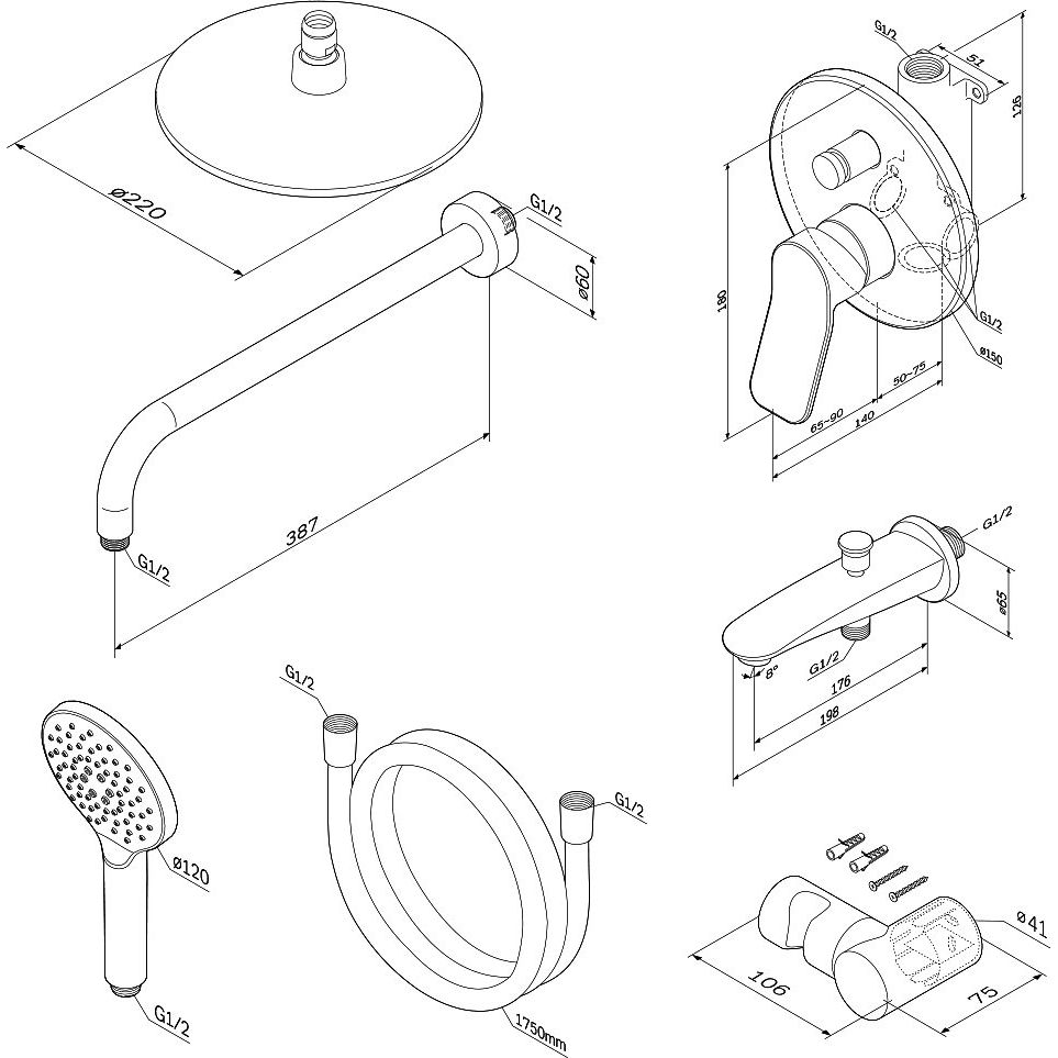 Душевой комплект включает в себя душевой гарнитур и верхний душ диаметром 22 см с одним режимом струи, а также ручную лейку с тремя режимами струи. Изделие оснащено фиксированным изливом длиной 17.6 см и переключателем потоков. Стандарт соединений — 1/2 дюйма, сантехническая подводка соответствует мировым стандартам. Латунные элементы с глянцевой поверхностью добавляют изделию изысканности.