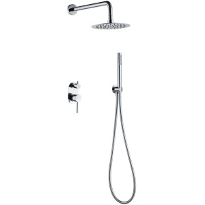 Душевой комплект включает в себя душевой гарнитур с верхним душем диаметром 30 см и фиксированным изливом. Оснащен смесителем для душа с керамическим картриджем, который обеспечивает плавную и надежную регулировку. Однорежимная струя верхнего душа и ручной лейки подойдут для повседневного использования. Подключение через шланг длиной 150 см с пластиковым покрытием стандартного размера 1/2. Надежная фиксация достигается с помощью кронштейна для верхнего душа и держателя для лейки.