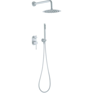 - Состоит из душевого гарнитура, верхнего душа, смесителя для душа, шлангового подключения и душевой лейки.
