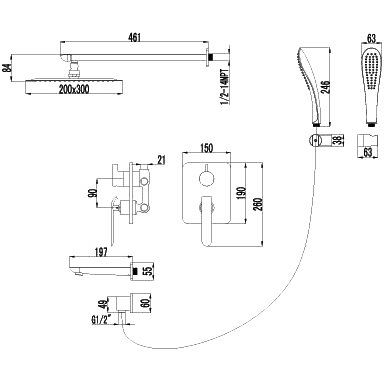 - Душевой гарнитур включает верхний душ, излив и смеситель для ванны с душем, а также настенный держатель и шланговое подключение.