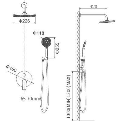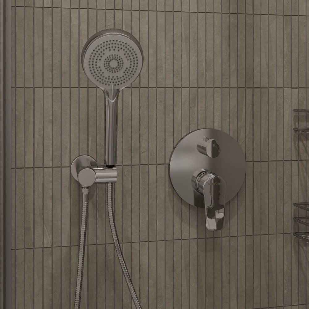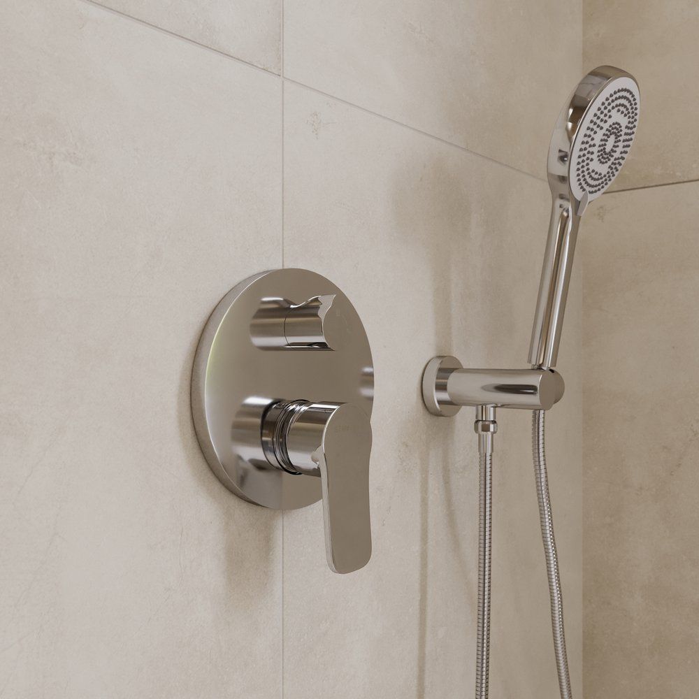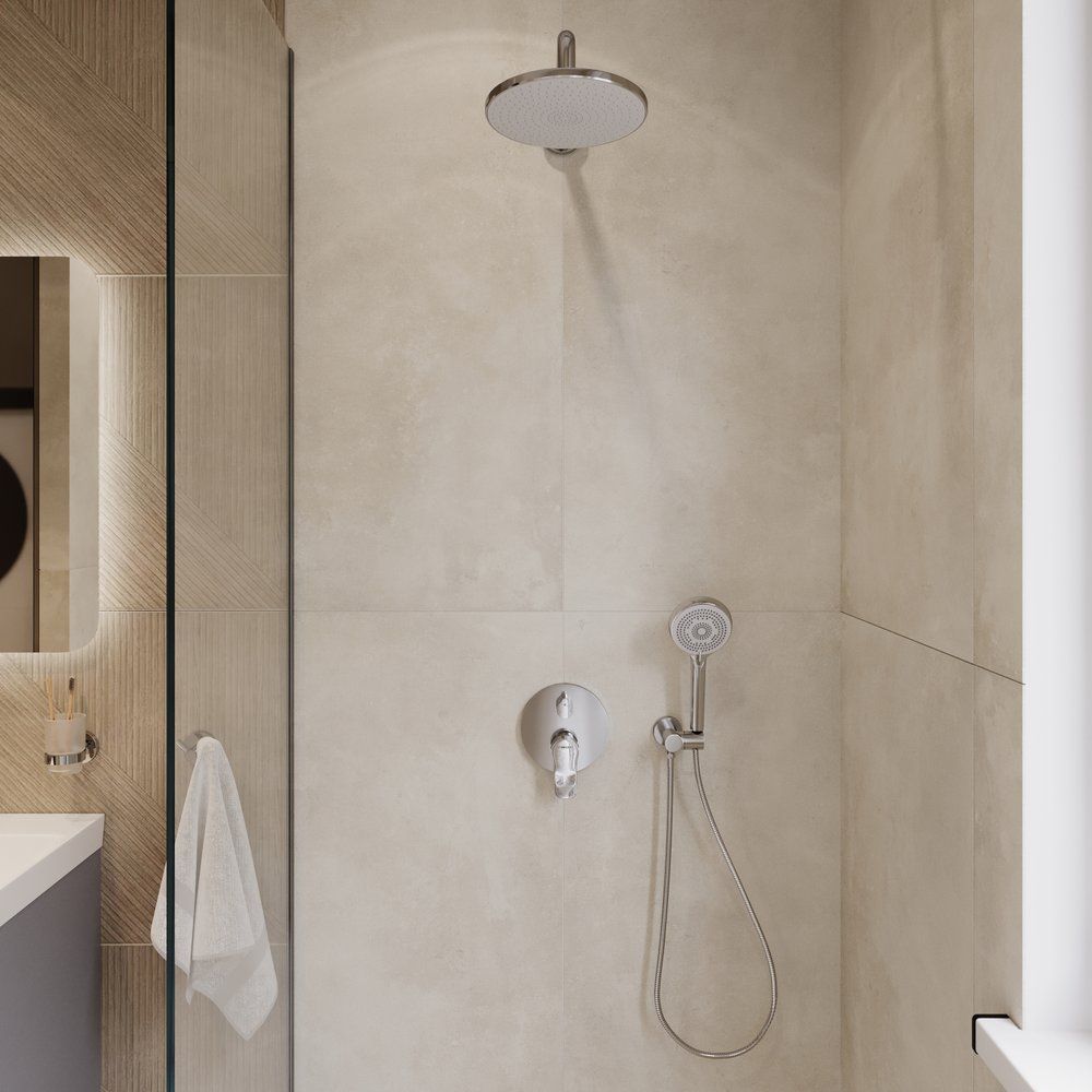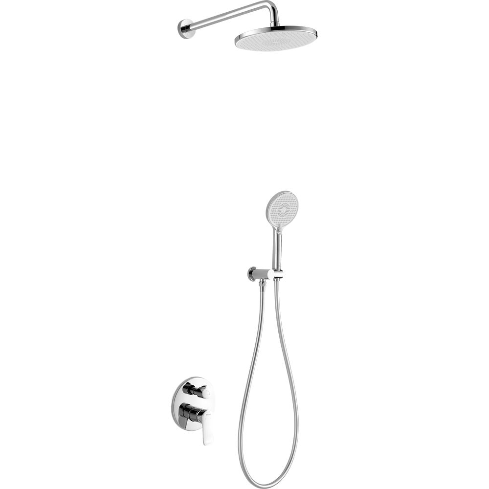 Душевой комплект включает в себя душевой гарнитур, верхний душ диаметром 22.6 см, и смеситель для душа. Подключение шланга выполнено с использованием стандартного подводки 1/2 и оснащено защитой от обратного потока благодаря встроенному клапану. Что касается режима струи, как верхний душ, так и ручная лейка имеют по одному режиму струи, поддерживая единообразие потоков. Кроме того, металлический шланг с поворотными конусами исключает перекручивание и обеспечивает долговечную эксплуатацию.