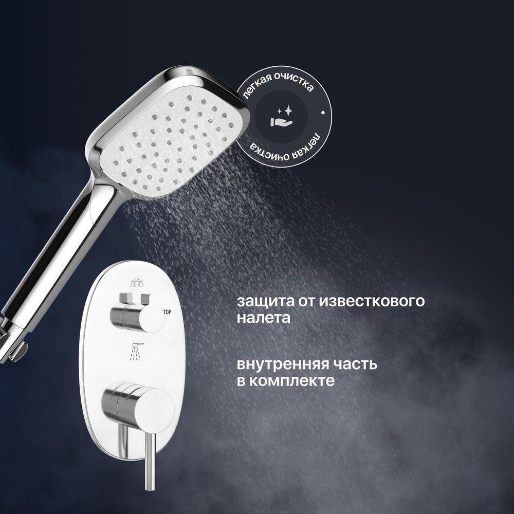 Душевой комплект включает душевой гарнитур и верхний душ диаметром 25 см с режимом струи. Смеситель обеспечивает удобное управление потоками, а душевой шланг длиной 150 см не перекручивается благодаря поворотным соединениям. Керамический картридж стандарта подводки 1/2 гарантирует долговечность и плавное движение. Изделие изготовлено из качественной латуни и АБС-пластика. Предусмотрены двусторонняя защита и функция экономии воды, что значительно снижает ее расход. Каждый компонент соответствует высоким стандартам качества, что подтверждается 5-летней гарантией от производителя.