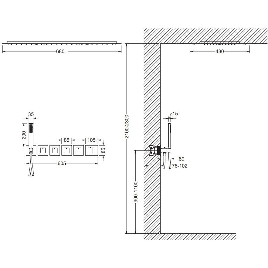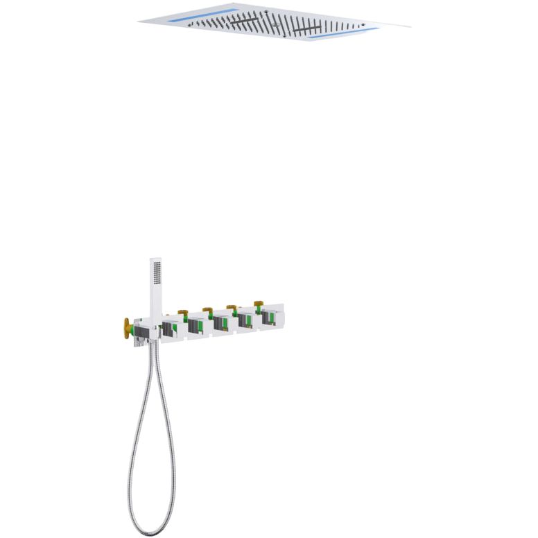 Душевой комплект включает в себя душевой гарнитур, верхний душ размером 68 см, который имеет три режима струи, а также удобную ручную лейку с одним режимом струи. Шланг длиной 150 см выполнен из металла, что обеспечивает его долговечность. Излив фиксированный, а стандарт подводки составляет 1/2 дюйма. Встроенный термостатический картридж гарантирует безопасность с ограничением температуры воды.