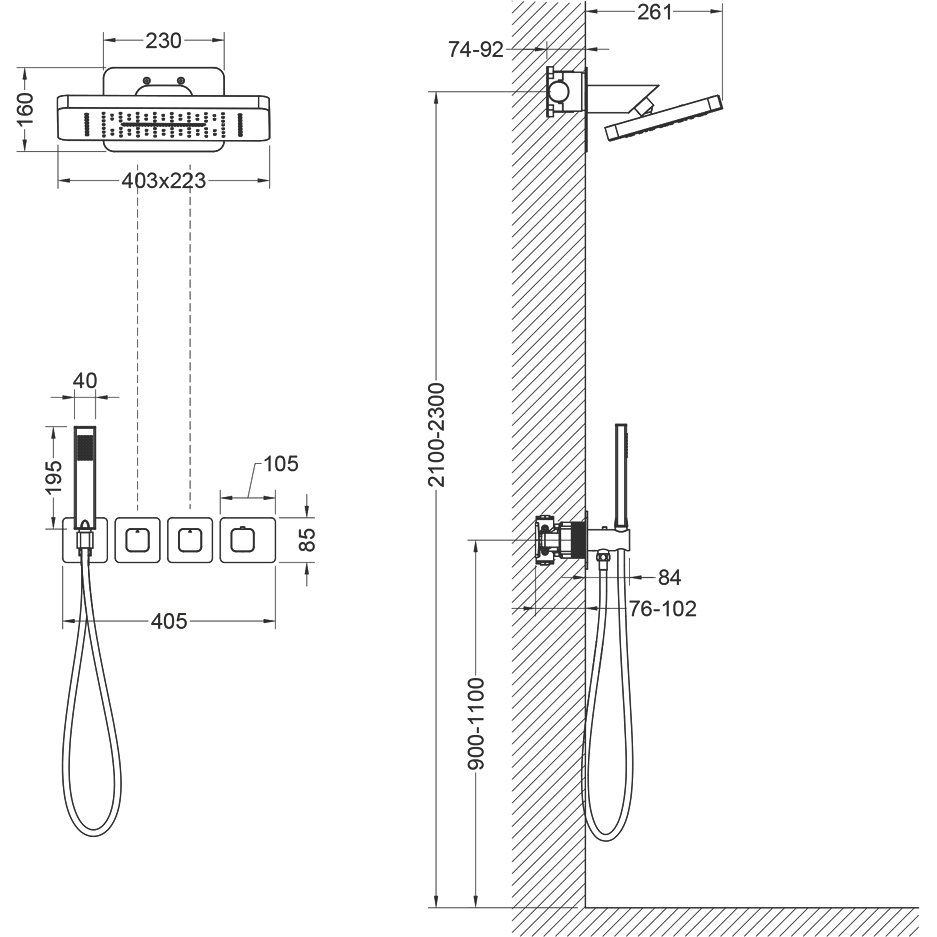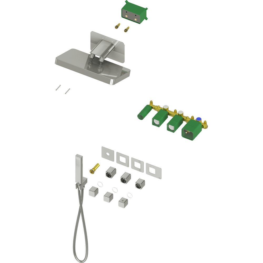 Душевой комплект включает душевой гарнитур, верхний душ, смеситель, шланговое подключение и термостат. Основные элементы выполнены из латуни с отдельными компонентами из пластика и обладают глянцевой поверхностью. Размер верхнего душа составляет 40,3 см, а длина металлического шланга — 150 см, что обеспечивает гибкость и комфорт при использовании. Соединения шланга оснащены поворотным конусом или подшипниками, предотвращающими перекручивание. Поворот керамической кран-буксы составляет 180°, а стандарт подводки 1/2 дюйма. Термостат ограничивает температуру воды для безопасности использования.