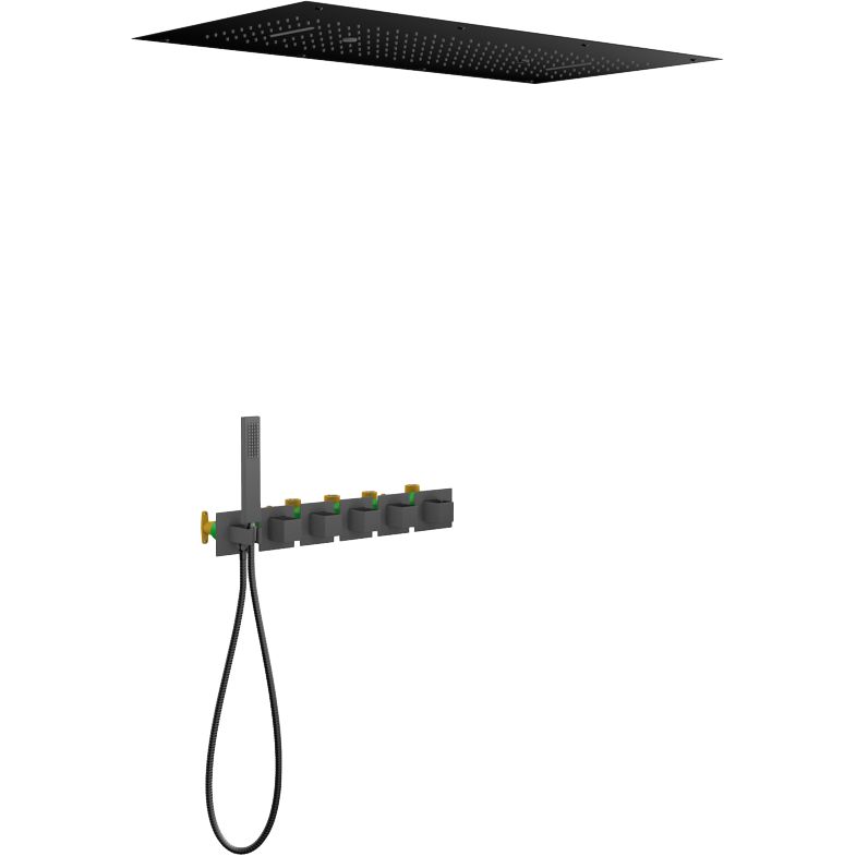 Душевой комплект включает в себя высококачественный душевой гарнитур с верхним душем диаметром 100 см. Верхний душ предлагает три режима струи, в то время как ручная лейка — один. Комплект оборудован термостатом и керамическим картриджем, что обеспечивает устойчивую работу и предотвращает протечки. Подключение по стандарту 1/2 и уточненная длина металлического шланга (150 см) позволяют легко интегрировать комплект в вашу ванную комнату.