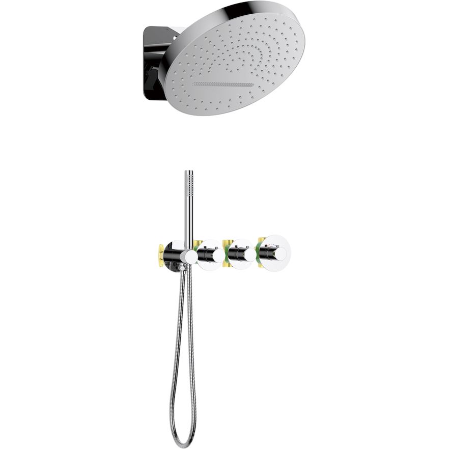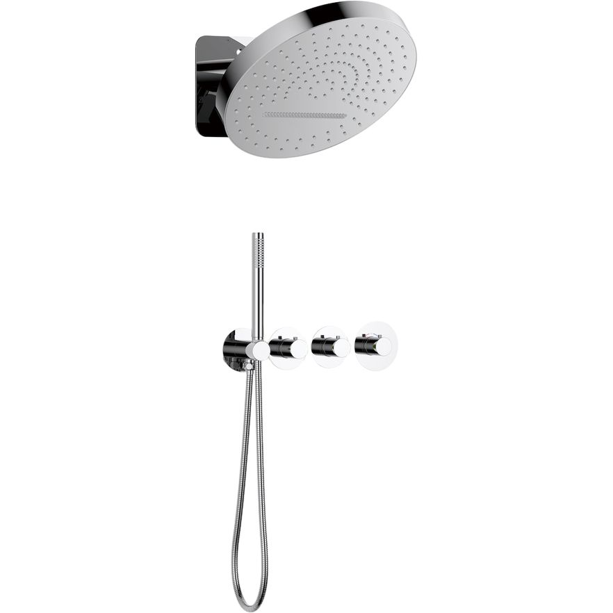 Комплект включает душевой гарнитур с верхним душем диаметром 32.3 см и двумя режимами струи, смеситель для душа с термостатом, ручной душ с одним режимом струи, а также держатель и кронштейн. Шланговое подключение длиной 150 см оснащено креплениями, предотвращающими перекручивание. Изделие выполнено из латуни и пластика, с глянцевой хромированной отделкой. Гарантия на продукт составляет 5 лет.