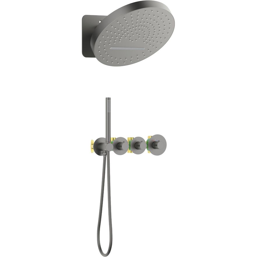 Душевой комплект включает в себя душевой гарнитур, верхний душ диаметром 32.3 см с двумя режимами струи, и ручную лейку с одним режимом. Глянцевая поверхность обеспечивает изысканный вид, а элементы из латуни и пластика гарантируют долговечность. Поворотные конусы и подшипники препятствуют перекручиванию 150-сантиметрового металлического шланга. Термостатический картридж обеспечивает безопасность и комфорт использования, ограничивая температуру воды до заданного уровня. Стандарт подключения — 1/2.