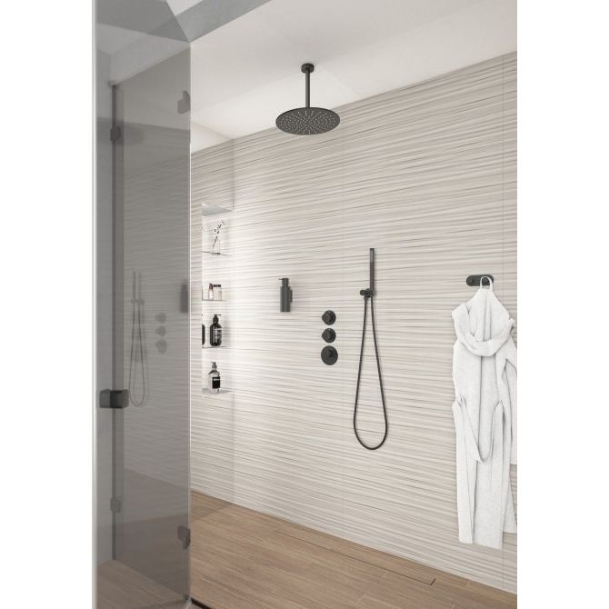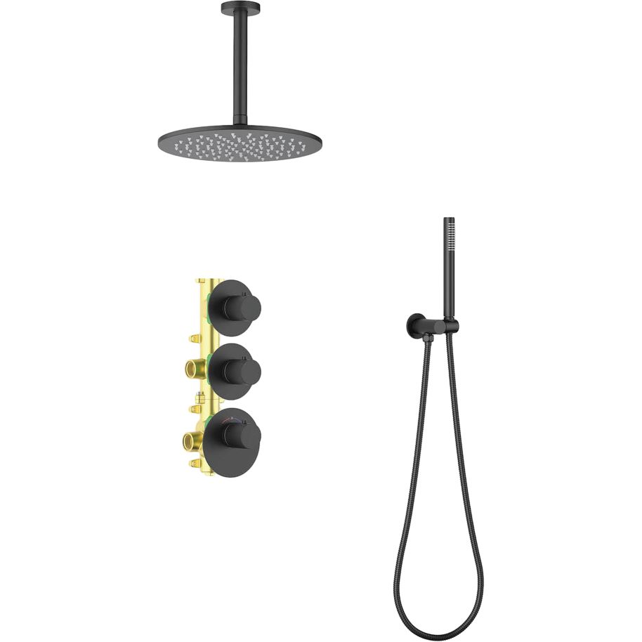 Душевой комплект включает душевой гарнитур, верхний душ диаметром 30 см с одним режимом струи, смеситель для душа с термостатическим картриджем и ограничением температуры, а также держатель для душа и кронштейн для верхнего душа. Специальное шланговое подключение длиной 150 см обеспечивает гибкость и удобство использования при любой конфигурации ванной комнаты. Поворотные конусы и подшипники на соединениях шлангов предотвращают перекручивание, что обеспечивает бесперебойную подачу воды.