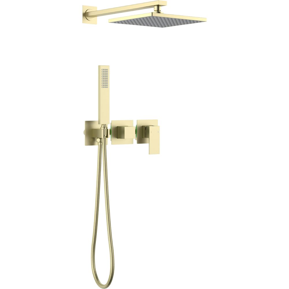 Комплект включает душевой гарнитур, верхний душ размером 23 см, и смеситель с переключателем потоков. Он изготовлен из латуни с матово-золотистым покрытием, а также включает элементы из прочного пластика. Длина металлического шланга составляет 150 см, что идеально подходит для удобного использования. Оба душа — и верхний, и ручной — имеют по одному режиму струи, что облегчает использование и обслуживание. Места соединений продуманно оборудованы поворотными механизмами для предотвращения перекручивания, а также высококачественным керамическим картриджем. Стандарт подключения 1/2 упрощает установку.