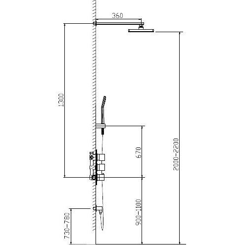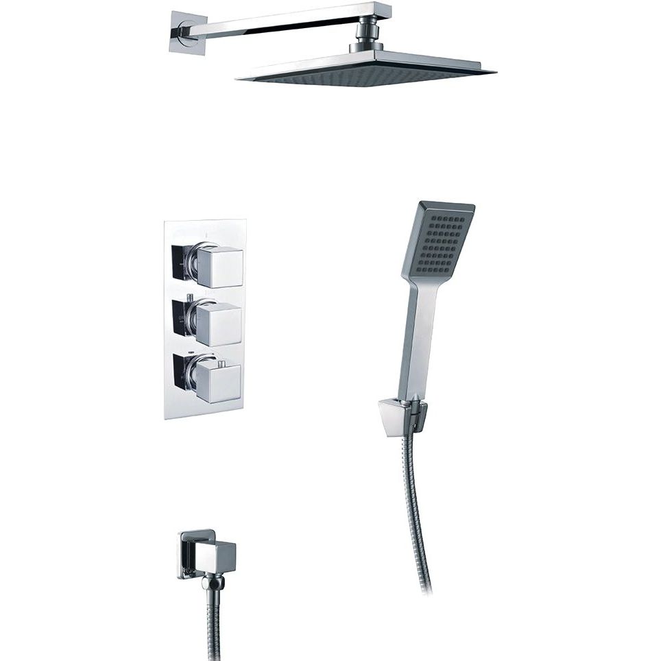 В комплект входит душевой гарнитур, смеситель, настенный держатель и шланговое подключение. Верхний душ диаметром 23 см с 1 режимом струи, а также ручная лейка с металлическим шлангом 150 см, оснащенным механизмом защиты от перекручиваний. Термостатический картридж обеспечивает стабильную температуру, а специальный вентиль защищает от обратного потока воды. Комплект также включает фиксированный излив и стандарт подводки 1/2.