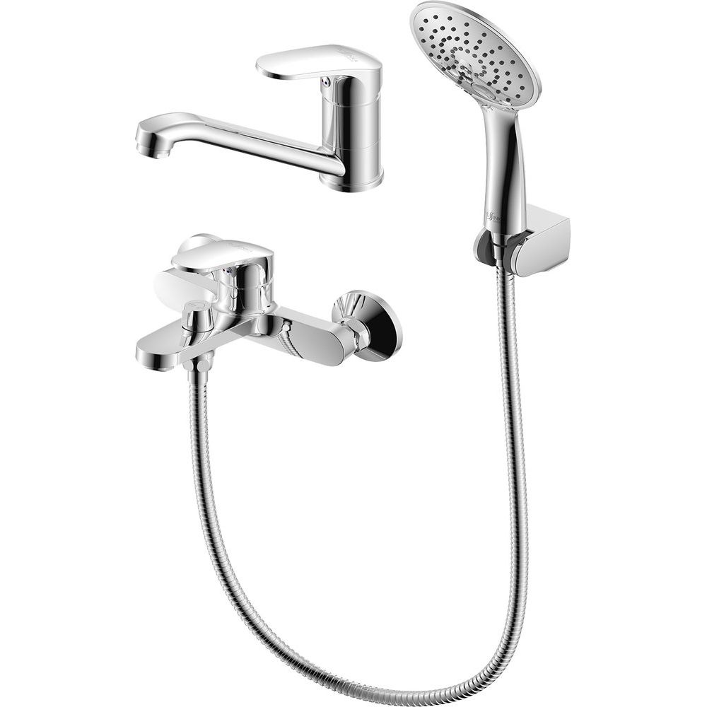 - Обширная функциональность: душевой комплект предлагает три режима струи, а смеситель для раковины обладает поворотным изливом для максимального удобства.