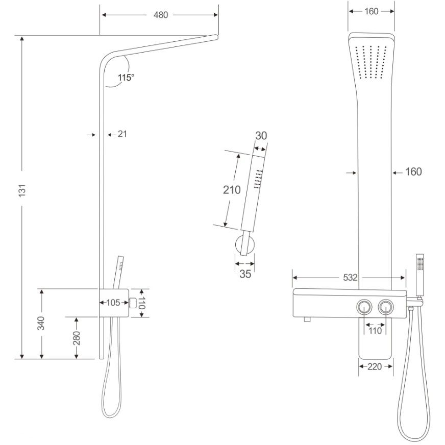 Панель имеет высоту 131 см с общими габаритами 131x48 см и шириной 52.3 см. Душевой шланг длиной 150 см оснащён пластиковым покрытием и соединён с лейкой с тремя режимами струи. Излив для наполнения ванны и керамический картридж обеспечивают комфорт и долговечность использования. В комплект также входит держатель для душа, переключатель потоков и аэратор. Гарантия — 1 год.