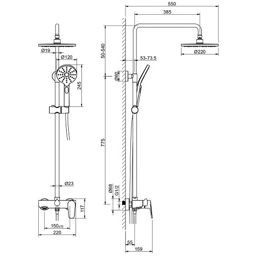 - Душевая штанга из нержавейки, диаметр 23мм