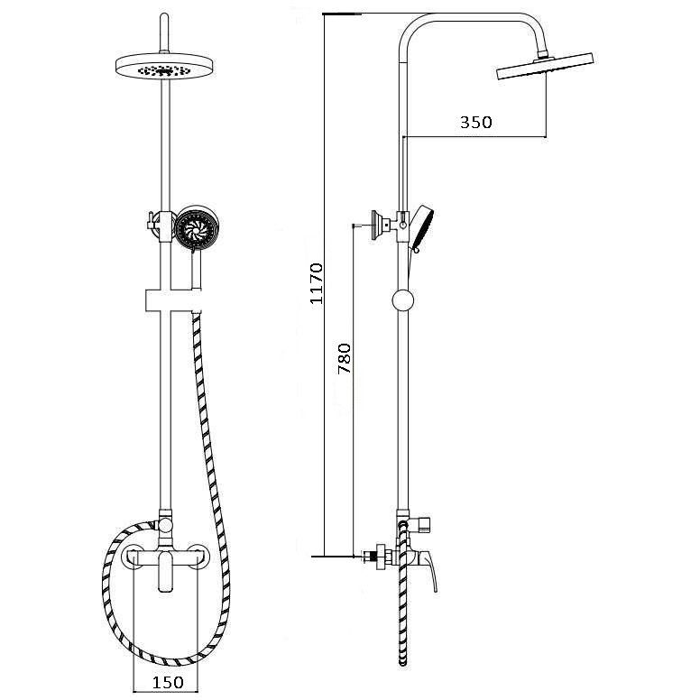 Душевая стойка имеет высоту 130 см и весит всего 2.7 кг, что облегчает её установку. Конструкция изготовлена из латуни и нержавеющей стали, обеспечивая долговечность и устойчивость к воздействию влаги. Верхний душ диаметром 22 см с вылетом 43 см обеспечивает широкий охват, а ручная лейка с диаметром 11.5 см оснащена двумя режимами струи для вашего удобства. Длина металлического шланга составляет 150 см, он оснащен поворотными конусами или специальными подшипниками, предотвращающими перекручивание. Стойка также включает в себя переключатель потоков, эксцентрики и надежный керамический картридж.