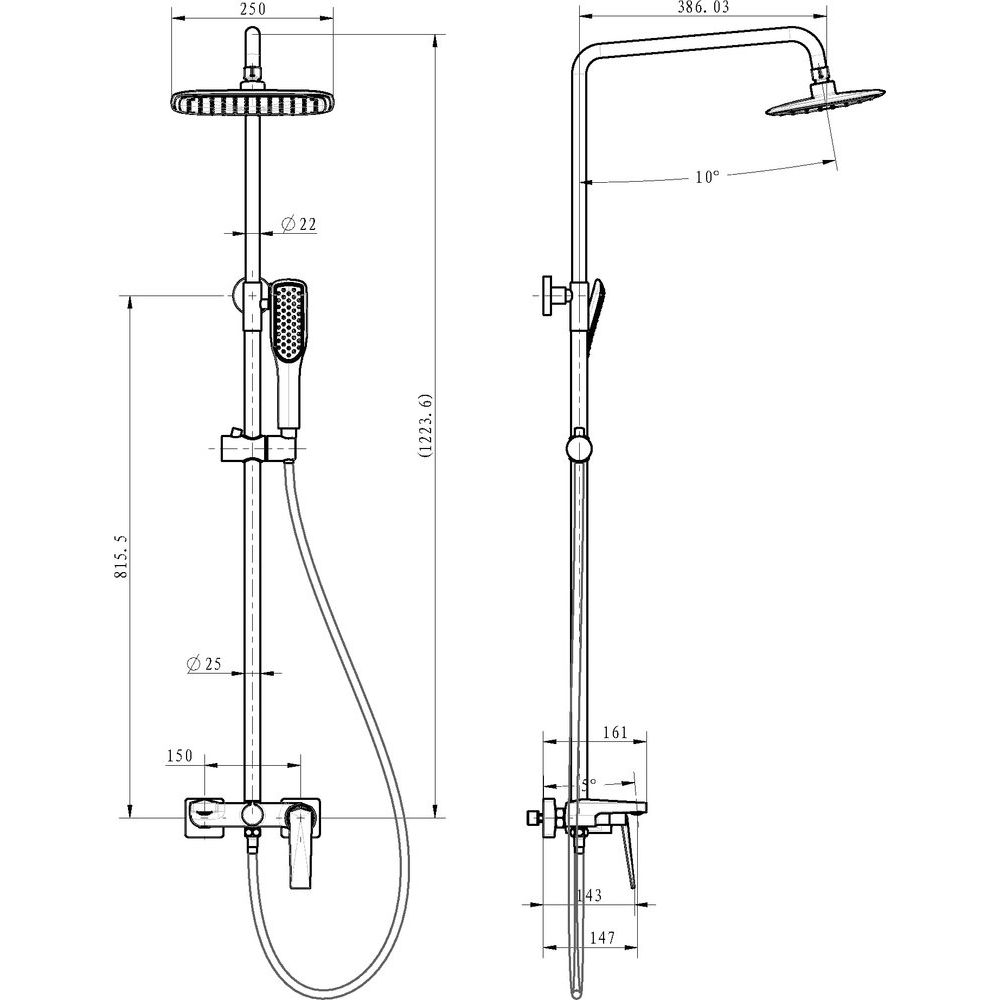 Душевая стойка Boheme Venturo 388-W имеет высоту 122.36 см и весит всего 7 кг, что облегчает процесс монтажа. Верхний душ диаметром 25 см обеспечивает обширную зону покрытия, а его вылет составляет 43.6 см, что создает комфортный угол падения струи воды. Лейка с одним режимом струи и металлический шланг длиной 150 см оснащены специальными подшипниками, препятствующими перекручиванию, что упрощает процесс использования. Длина излива составляет 14.3 см, с традиционным фиксированным изливом. Встроенный переключатель потоков и аэратор обеспечивают плавное управление водой, а керамический картридж гарантирует долговечность и комфортное использование. В комплекте идут душевой шланг, лейка, держатель и смеситель, что делает установку и эксплуатацию еще проще.