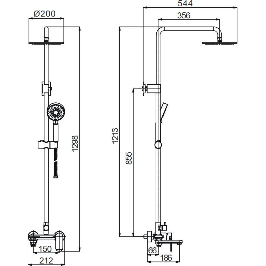 Душевая стойка имеет высоту 121.3 см и отличается прочной конструкцией из нержавеющей стали. Верхний душ диаметром 20 см и вылетом 35.6 см обеспечивает полноценный поток воды, создавая эффект дождя. Эргономичная лейка диаметром 8 см с одним режимо струи спроектирована для комфортного использования. Излив длиной 12 см поворотный и традиционный, а длина шланга составляет 150 см, что позволяет свободно перемещаться в душе.