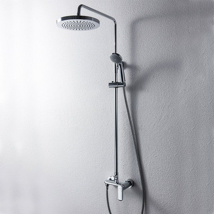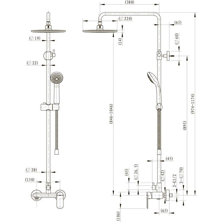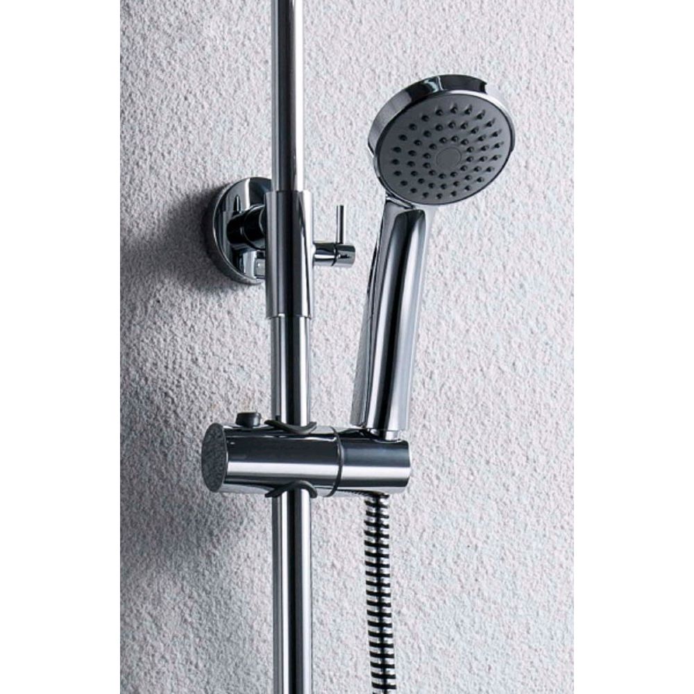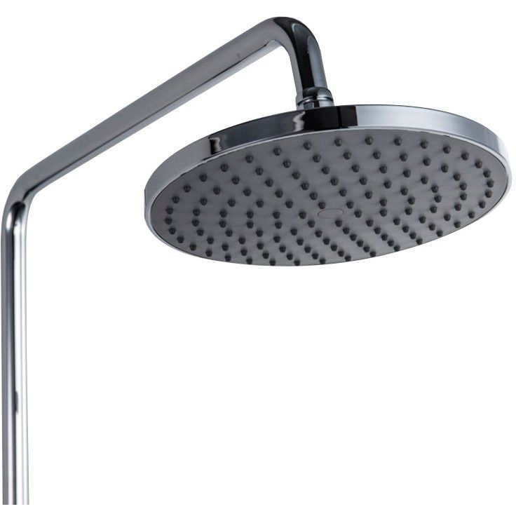 Душевая стойка имеет высоту 120.9 см и весит 4.65 кг. Ее основные части изготовлены из прочной латуни, в то время как некоторые элементы выполнены из пластика. Верхний душ диаметром 22 см с вылетом 44.5 см обеспечивает широкий поток воды, а лейка с одним режимом струи подходит для повседневного использования. Шланг длиной 150 см изготовлен из износостойкого пластика. В комплект входят все необходимые элементы: душевой шланг, лейка, держатель, переключатель потоков, крепления и эксцентрики, а также смеситель.