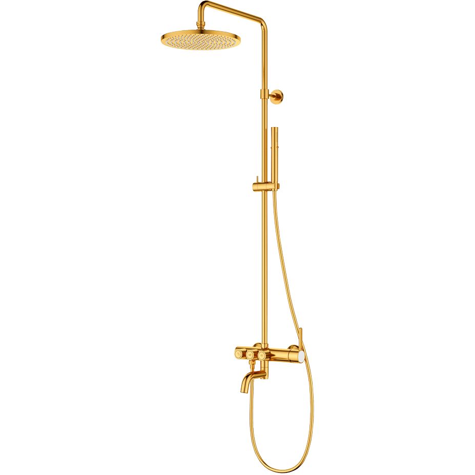 Душевая стойка высотой 127 см изготовлена из прочной латуни, что гарантирует долговечность и устойчивость к коррозии. Верхний душ с вылетом 43 см обеспечивает широкий охват воды, идеальный для расслабляющего душа. Длина пластмассового шланга составляет 150 см, а керамический картридж в комплекте обеспечивает надежность и долговечность системы. В набор также входит держатель для душа, переключатель потоков и аэратор. Смеситель уже установлен, а основной излив традиционного типа. Стойка поставляется с гарантией на 2 года.