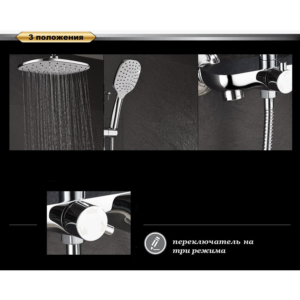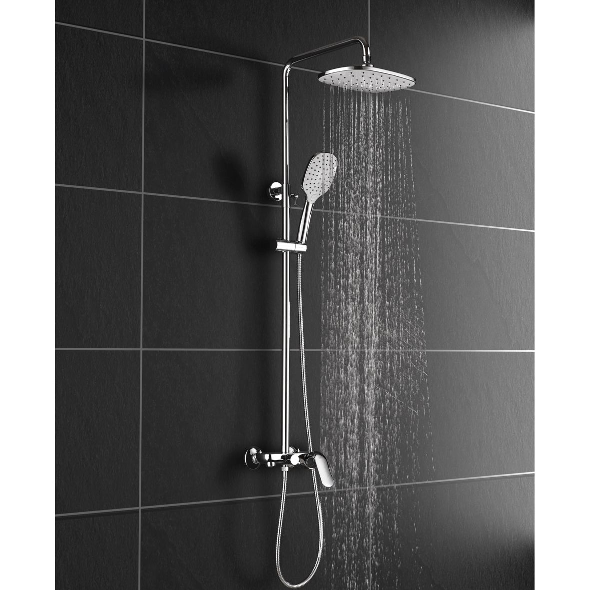 Высота душевой стойки составляет 115 см, что обеспечивает комфортное использование как высоким, так и более низким пользователям. Верхний душ диаметром 20 см и вылетом 41,7 см делает процесс принятия душа приятным, окутывая тело мягким потоком воды. Места соединений шланга с лейкой и смесителем оснащены поворотными конусами или специальными подшипниками, что предотвращает перекручивание шланга и сохраняет его долговечность.