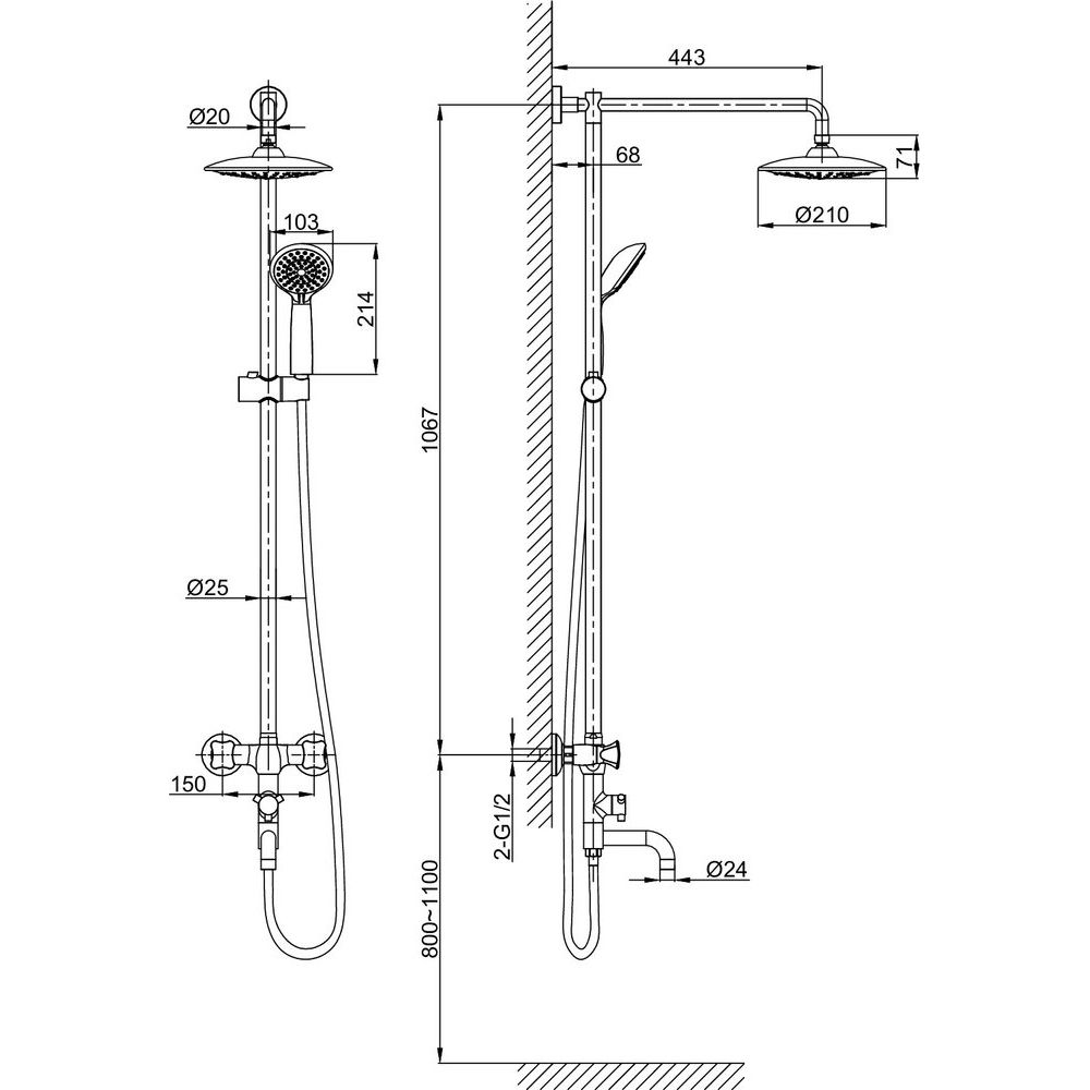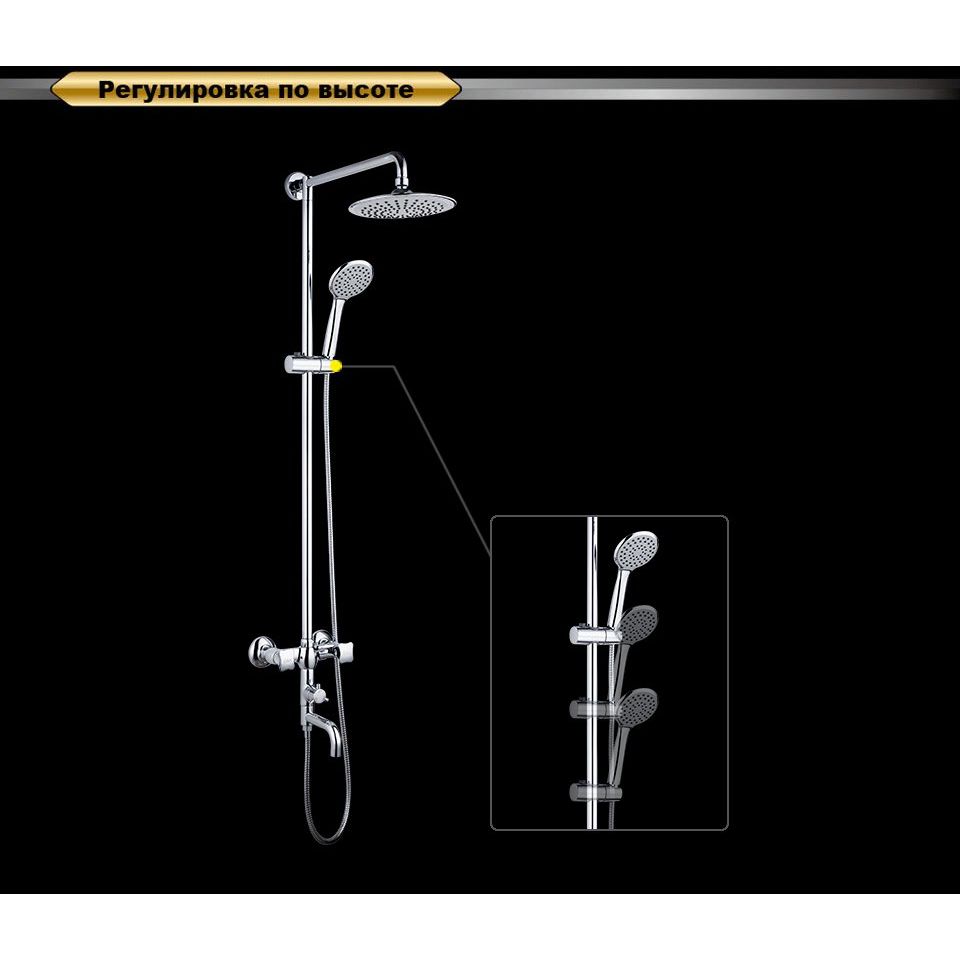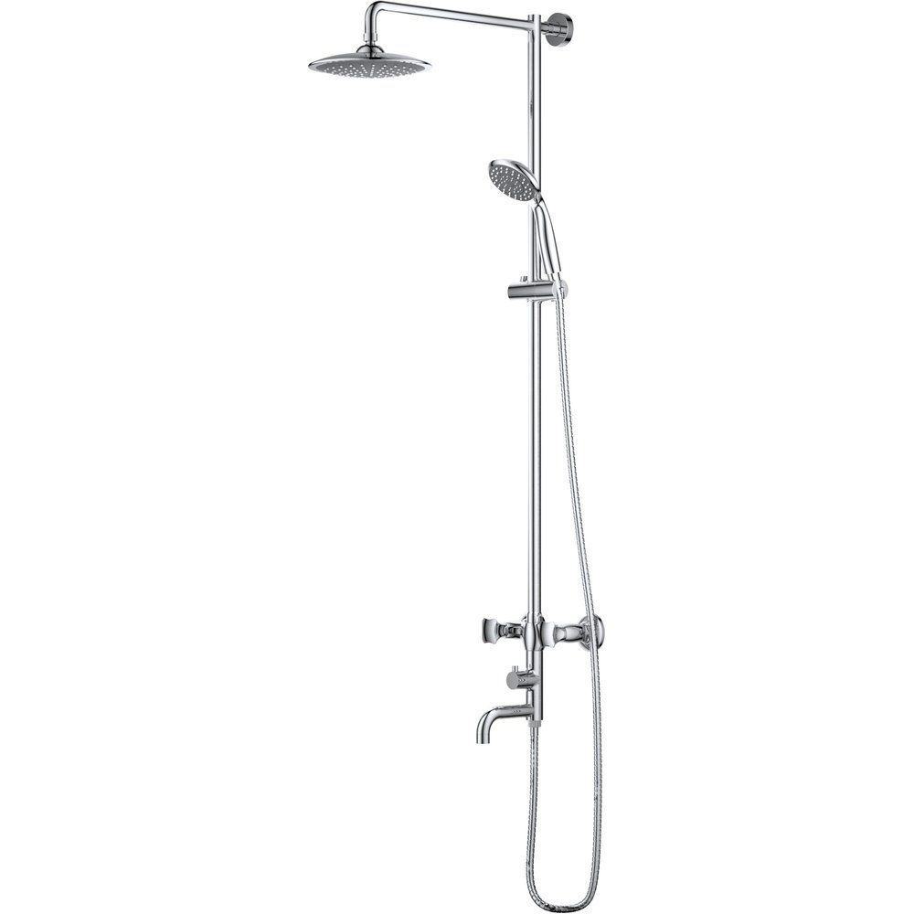 Душевая стойка имеет высоту 106.6 см и оснащена крупным верхним душем диаметром 21 см, вылет которого составляет 44.3 см, что позволяет создать обволакивающий поток воды. Лейка имеет одну струю с диаметром 10.3 см, обеспечивая мощный поток для эффективного купания. Излив длиной 12.5 см фиксирован и выполнен в традиционном стиле. Металлический шланг длиной 150 см оснащён поворотными конусами, предотвращающими перекручивание. В комплекте: душевой шланг, лейка, держатель, переключатель потоков и аэратор. Смеситель уже входит в комплект, что значительно упрощает установку.