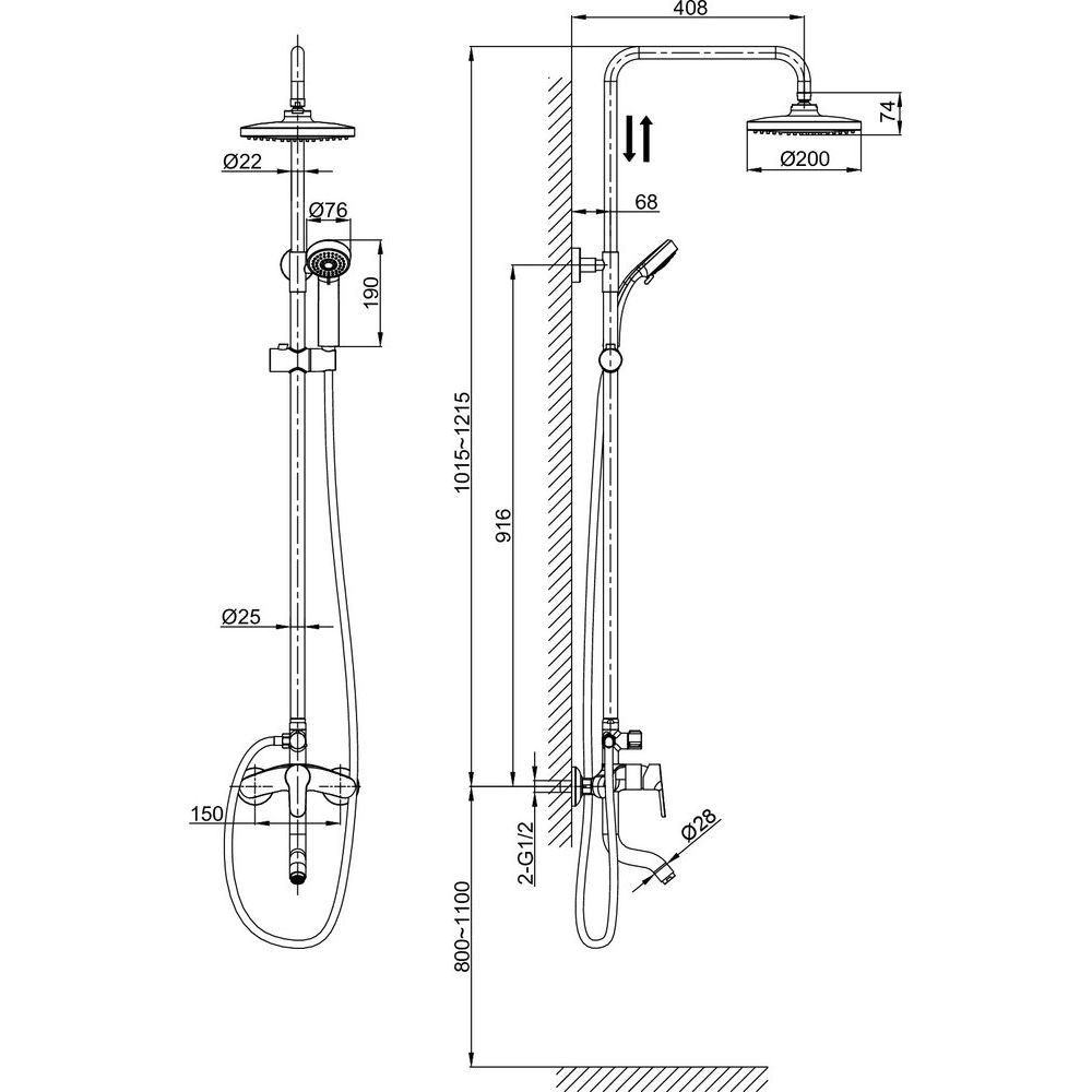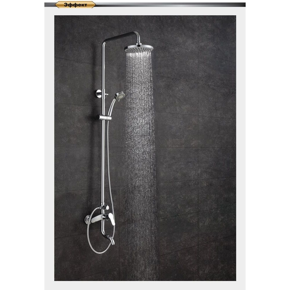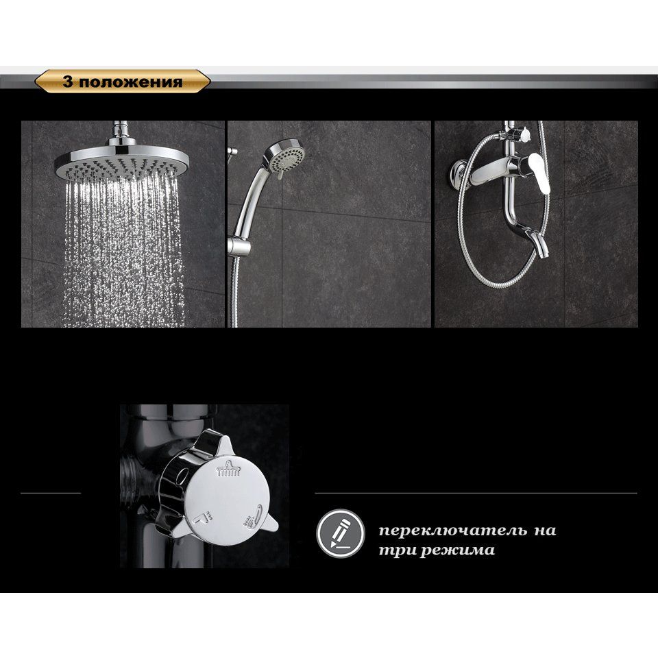 Высота душевой стойки составляет 121,5 см, что делает её удобной для пользователей разного роста. Верхний душ с диаметром 20 см имеет вылет 40,8 см, обеспечивая полноценное покрытие водой. Лейка диаметром 7,6 см предлагает один режим струи для расслабляющего душа. Металлический шланг длиной 150 см оснащен защитой от перекручивания, сохраняя эстетичный вид и функциональность. В комплект входит держатель для душа, переключатель потоков и аэратор, полностью готовые к монтажу.
