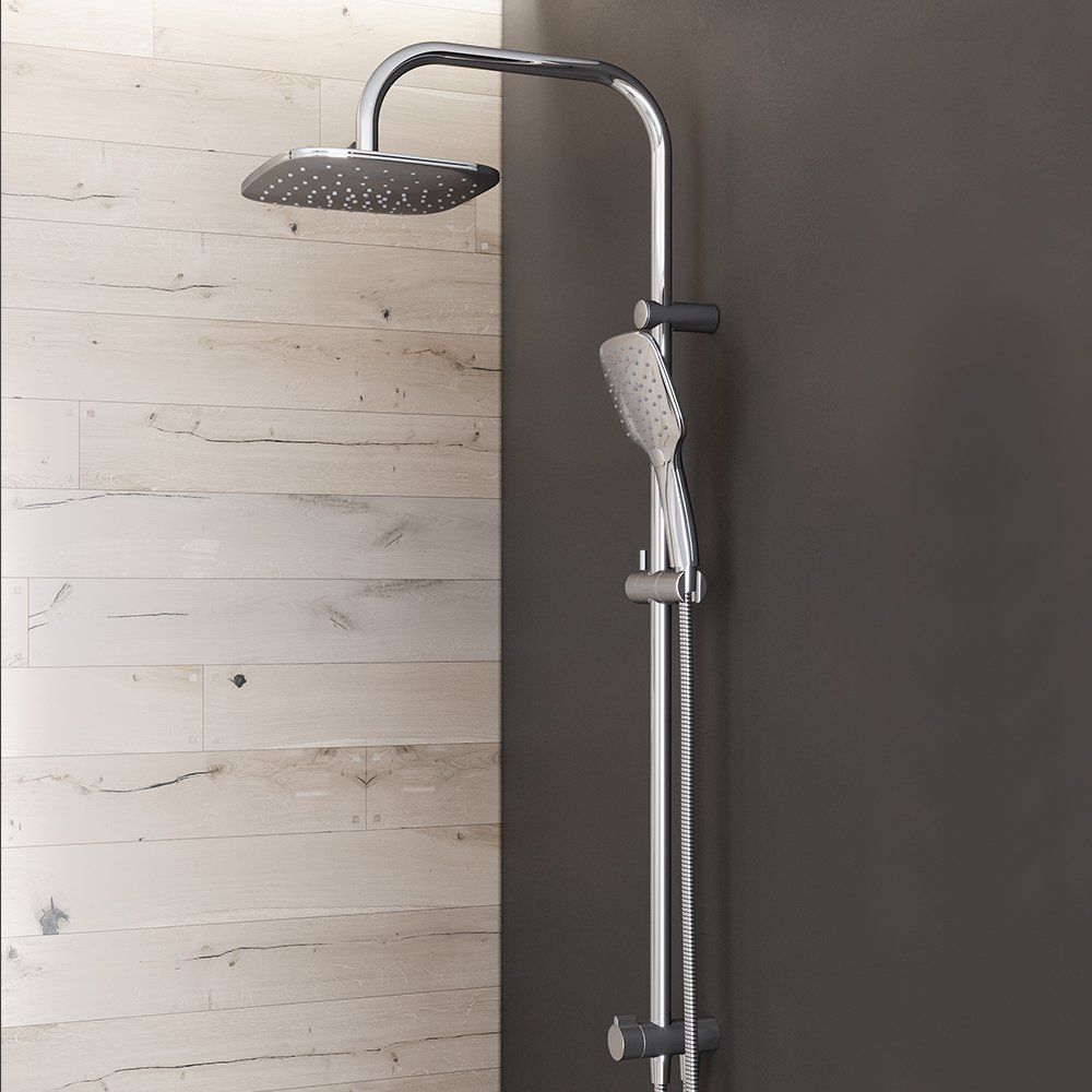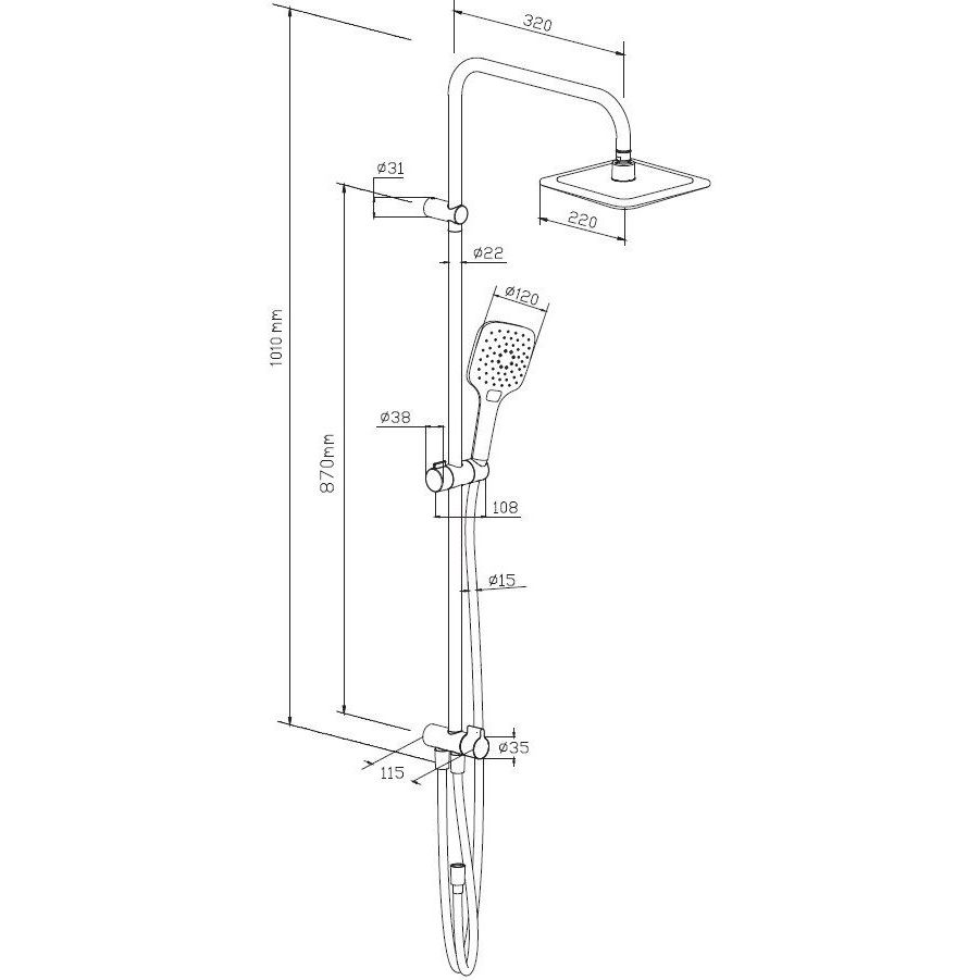 Душевая стойка имеет высоту 101 см и весит 2.8 кг. Верхний душ диаметром 22 см и вылетом 40 см обеспечивает ощутимый поток воды, а лейка размером 12 см предлагает три различных режима струи. Металлический шланг длиной 150 см устойчив к перекручиванию вследствие специально продуманной конструкции соединений. Дополнительно в комплект входят душевой шланг, душевая лейка, держатель для душа и переключатель потоков. Предоставленная производителем гарантия составляет 2 года.