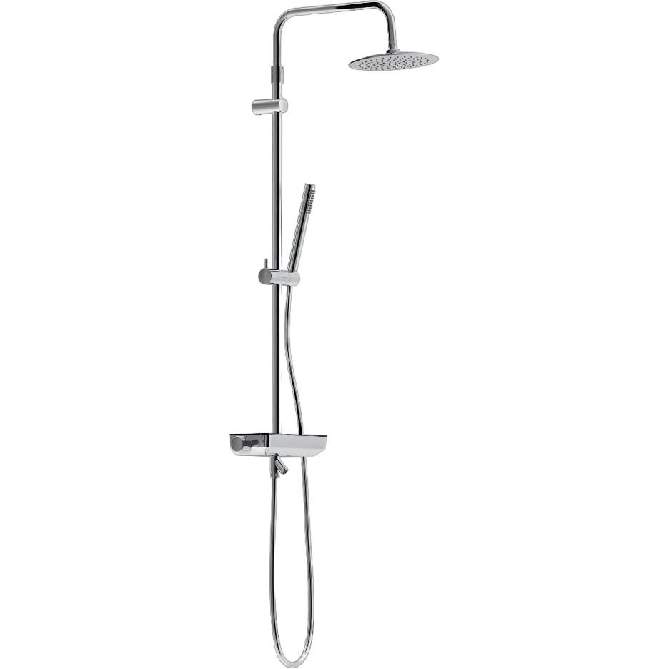 Душевая стойка высотой 145 см весит всего 2.5 кг и изготовлена из надежной латуни с отдельными пластиковыми элементами. Верхний душ диаметром 25 см имеет вылет 37.2 см, а ручная лейка диаметром 5.4 см оснащена одним режимом струи. Шланг имеет длину 175 см и оснащен поворотными конусами, препятствующими перекручиванию. В комплект входит смеситель с ограничением температуры воды и 10-летней гарантией.