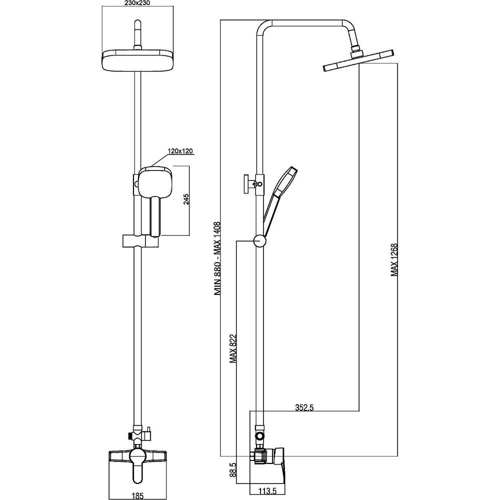 Душевая стойка имеет высоту 149.65 см и весит 2.6 кг. Комбинация материалов, таких как высокотехнологичный полимер, пластик, и нержавеющая сталь, обеспечивает надежность и стиль. Верхний душ диаметром 23 см с вылетом 35.25 см создаёт ощущение тропического дождя. Душевая лейка диаметром 12 см поддерживает один режим струи. Все соединения шлангов надежны, длина шланга составляет 150 см. Керамический картридж обеспечивает долговечность, и вся конструкция устойчива к перепадам температур и коррозии.