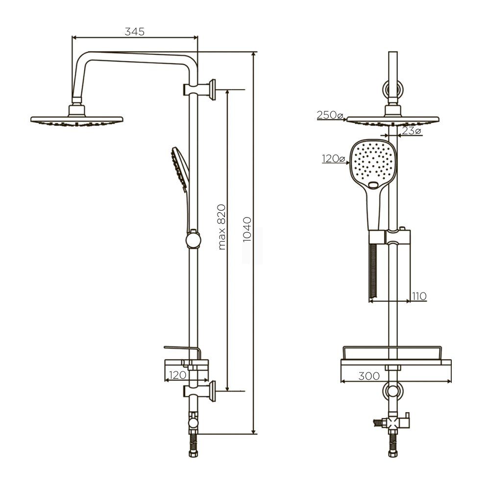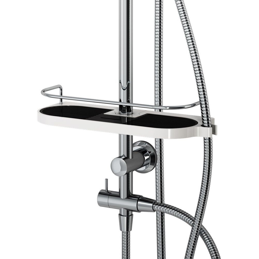 Душевая стойка имеет высоту 104 см и включает душевой шланг длиной 175 см. Верхний душ размером 25 см предлагает комфортный вылет в 39,5 см, позволяя оптимально распределить поток воды. Лейка диаметром 12 см предлагает пять режимов струй, а ее соединения, оснащенные поворотными элементами, предотвращают перекручивание шланга. Конструкция изготовлена из латуни и пластика, что обеспечивает прочность и долговечность изделия.