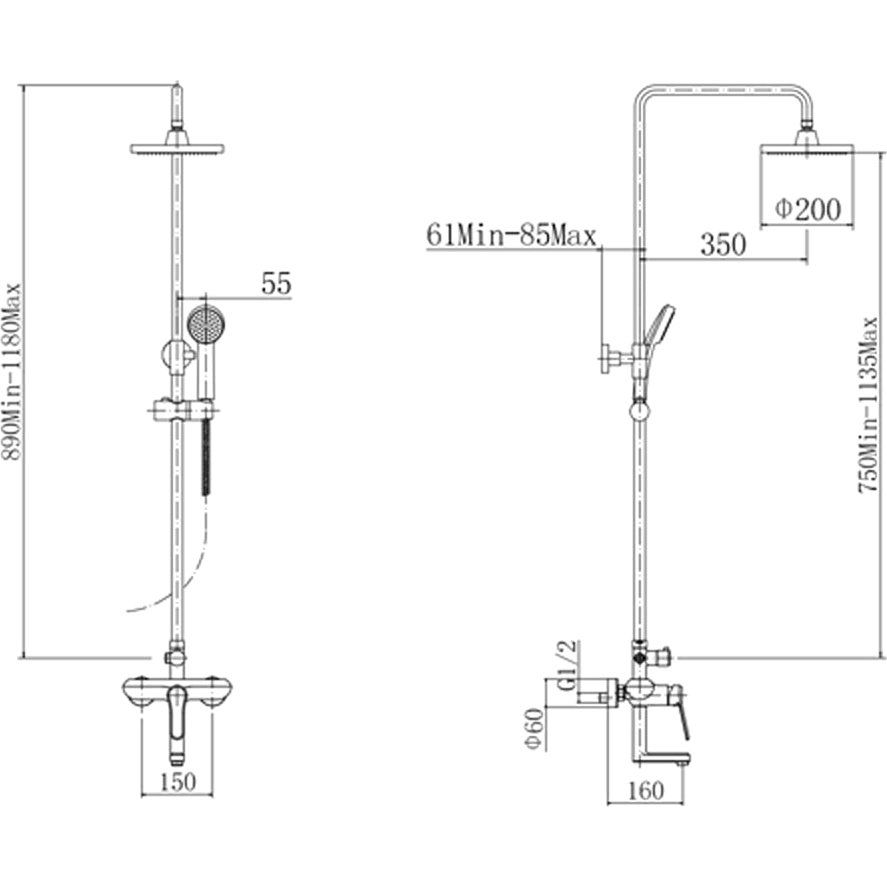 - Размеры верхнего душа: 20 см, вылет: 43.5 см