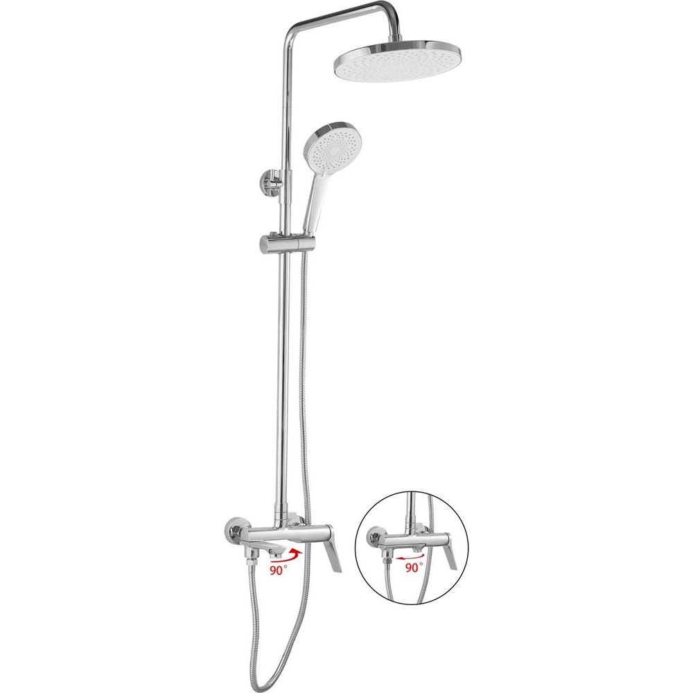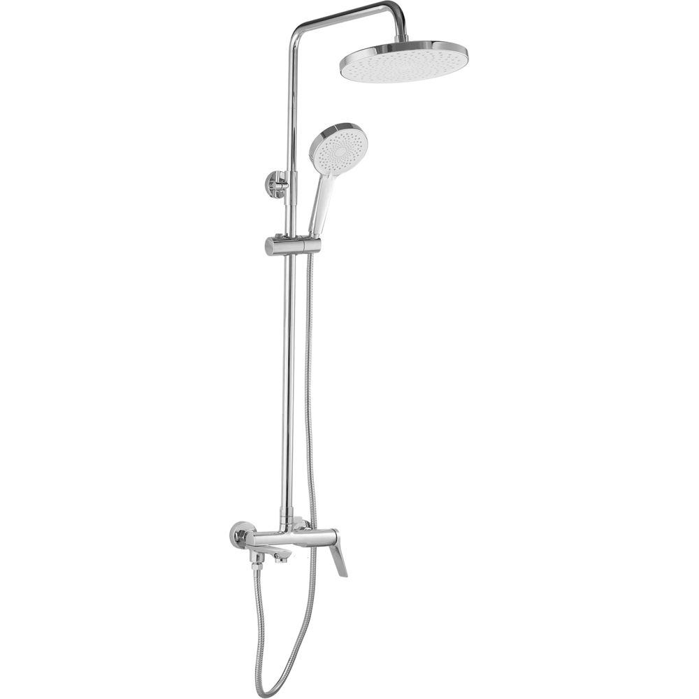 - Полный комплект включает душевую стойку, душевой шланг, душевую лейку, держатель для душа и эксцентрики.