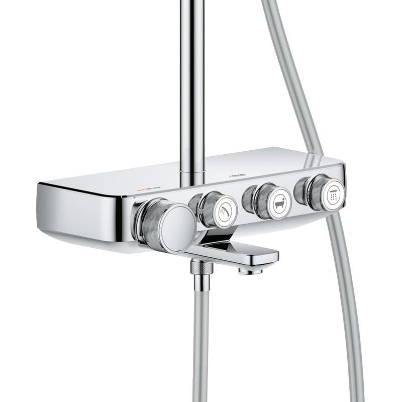 Душевая стойка Grohe Euphoria SmartControl 260 Mono 26510000 — это сочетание передовых технологий с элегантным дизайном, обеспечивающее комфорт и удовольствие от принятия душа. Подключите эту модель к вашему водопроводу и наслаждайтесь разнообразием функций. Верхний душ с тремя режимами струи позволяет выбрать между мощным Jet, энергичным SmartRain и обволакивающим Rain. Переключение между режимами осуществляется простым поворотом кнопки. Ручной душ регулируется по высоте и предлагает режимы Rain, SmartRain и расслабляющий Massage. Задумайтесь о безопасности: функция TurboStat обеспечивает стабильную температуру воды, а технология CoolTouch защитит вас от ожогов.