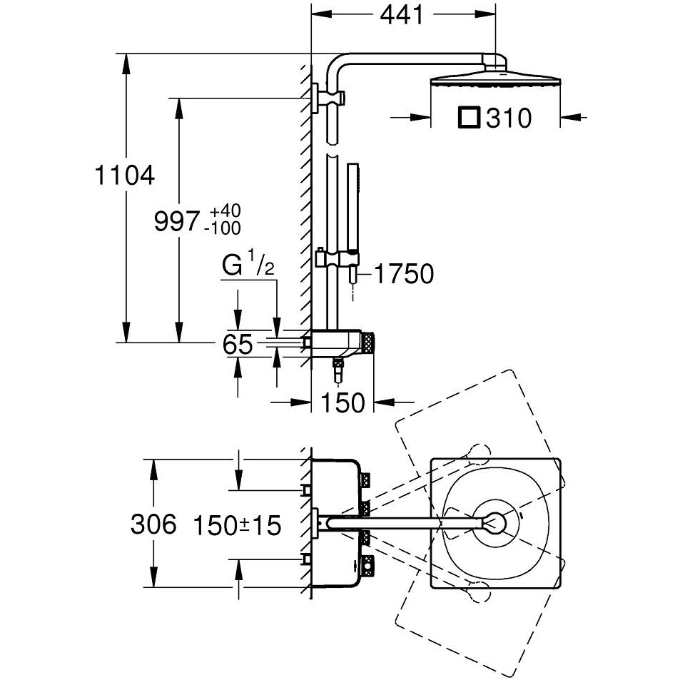 Высота душевой стойки составляет 113.7 см, что обеспечивает удобство для пользователей любого роста. Верхний душ диаметром 31 см и вылетом 44.1 см создает полноценный водяной поток. Ручная лейка с размером 21.6 см поддерживает два режима струи для вашего комфорта. Душевой комплект включает термостатический картридж, который гарантирует безопасность и удобство управления температурой.