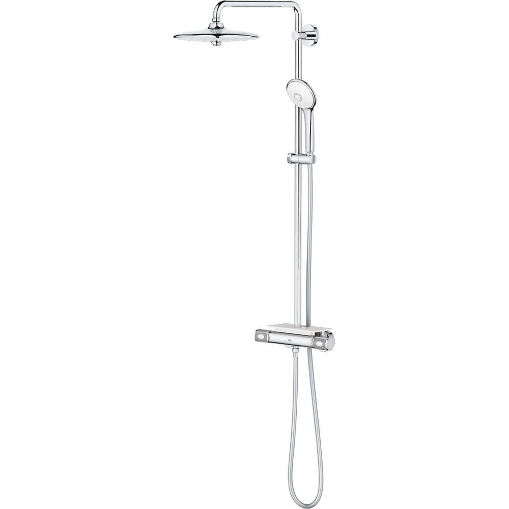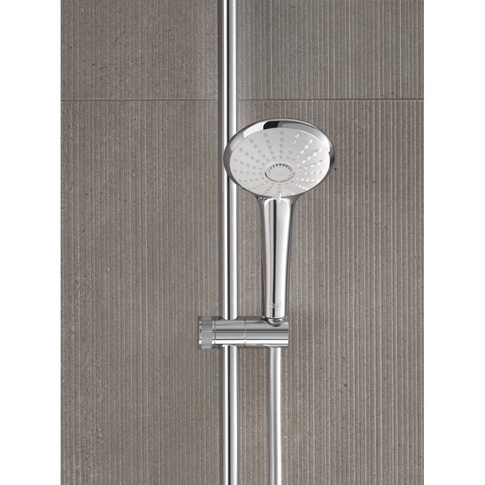 Душевая стойка Grohe Euphoria System 260 высотой 115.1 см выполнена из прочной латунной основы с пластиковыми элементами, весом 6.4 кг. В комплект входит верхний душ диаметром 26 см и вылетом 47.2 см, а также душевая лейка Euphoria с 3 режимами струи и компактным размером 11 см. Усовершенствованный аквадиммер помогает экономить воду и энергию. Шланг длиной 175 см оснащен специальными подшипниками, предотвращающими перекручивание, и совместим с водонагревателями мощностью свыше 18 кВ/ч.