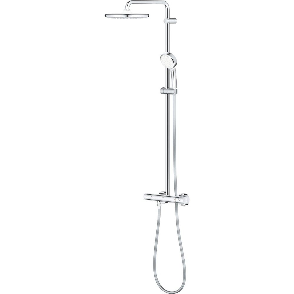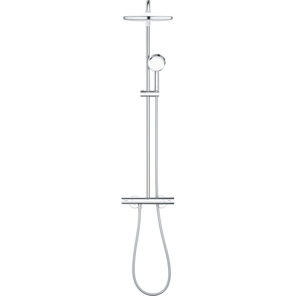 Откройте для себя продукцию высшего уровня с душевой стойкой Grohe Tempesta Cosmopolitan System 250. Этот элегантный комплект, выполненный в хромированном оформлении, сочетает в себе современный дизайн и передовые технологии, чтобы вы могли наслаждаться комфортом каждого принятия душа. В комплект входит душевой термостат, который обеспечивает стабильную температуру воды, а верхний душ диаметром 31 см и вылетом 41,2 см обеспечивает обильный поток воды. Ручная лейка с двумя режимами струи поможет вам настроиться на нужное настроение – будь то расслабление под "Rain" или бодрящий "Jet".